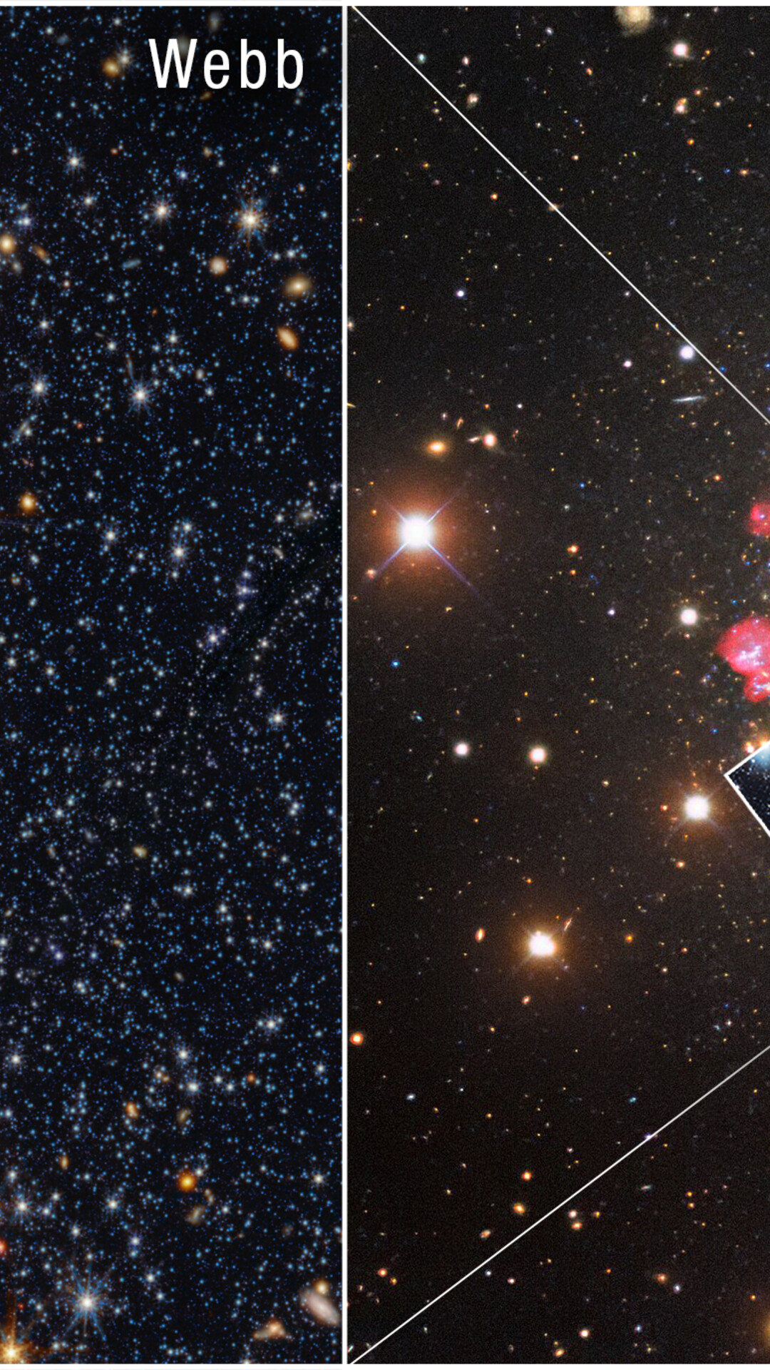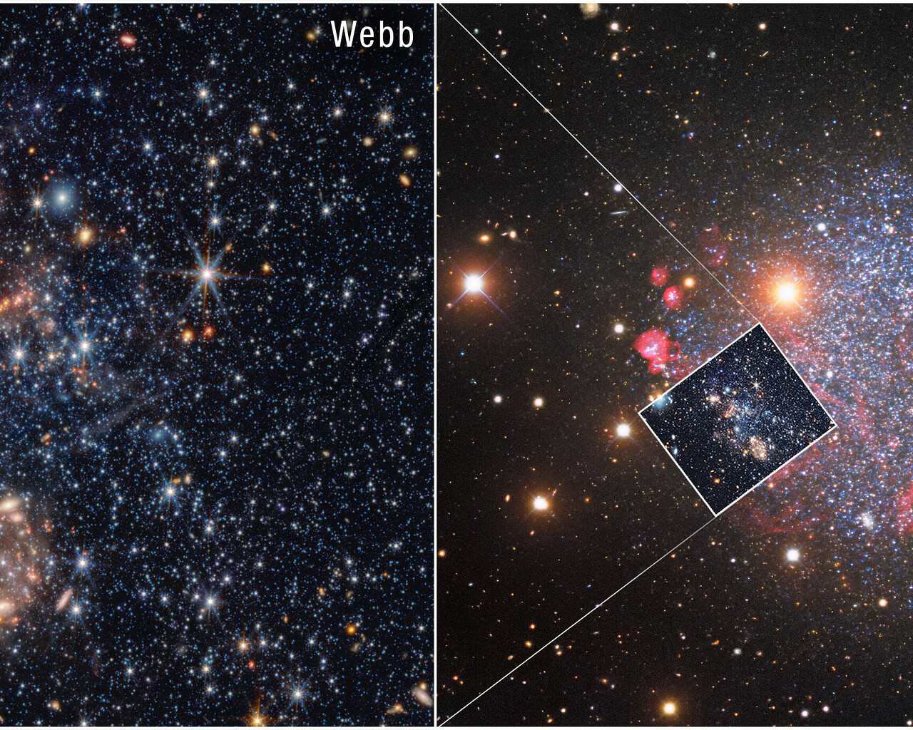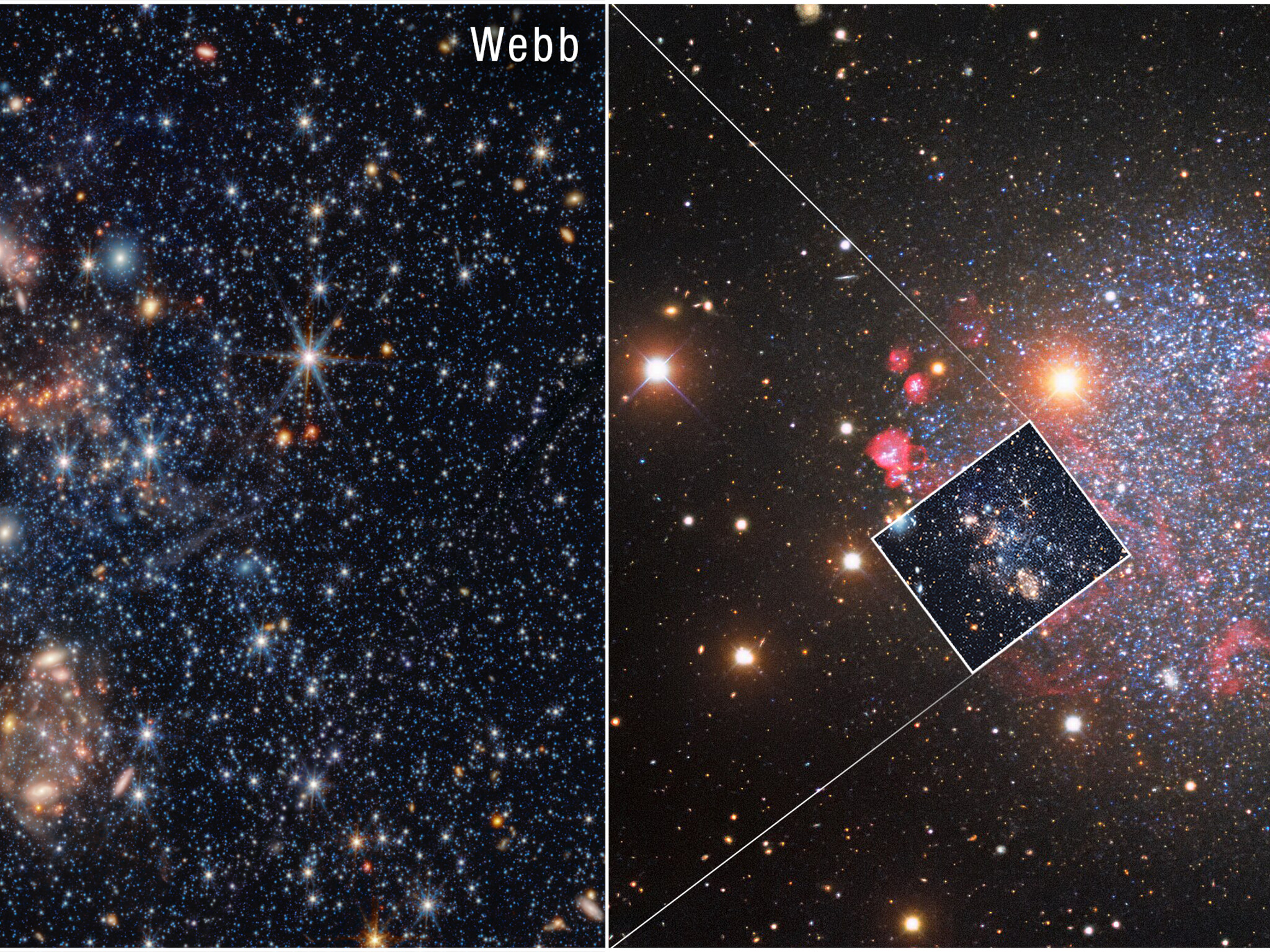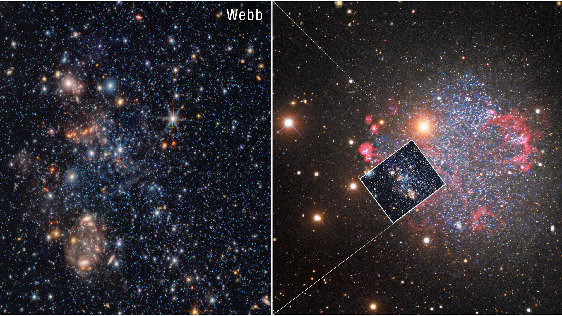 This Webb image of a portion of the nearby Sextans A galaxy is put into context using a ground-based image from the Nicholas U. Mayall 4-meter Telescope at Kitt Peak National Observatory. The image from Webb shows the galaxy in both near- and mid-infrared light, while Kitt Peak captures optical, or visible, light.