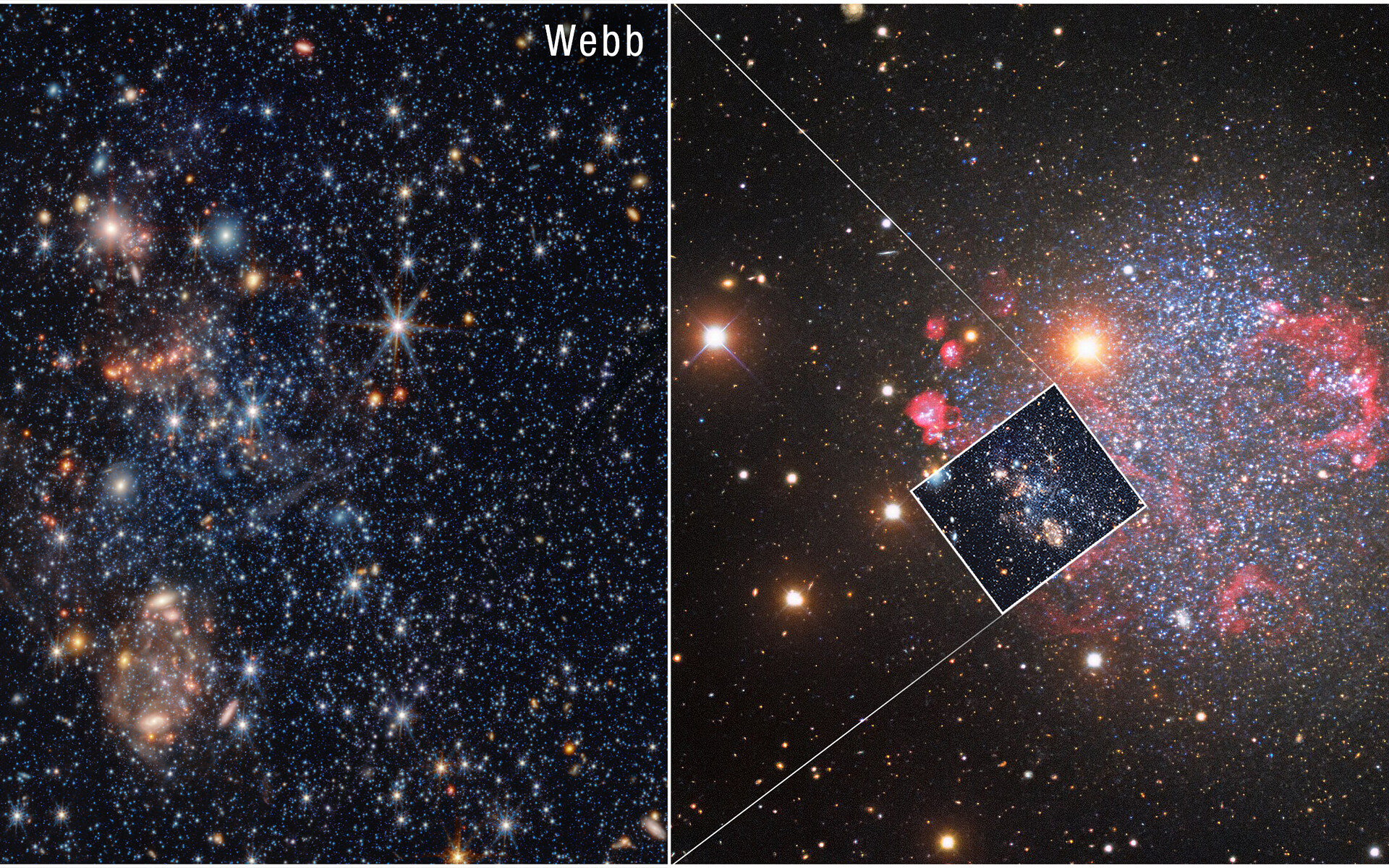 [Image description: Two panels showing different views of a small galaxy. The left panel, labeled Webb, shows a region of space filled with stars and small clumps of glowing orange and tan dust. The right panel is labeled KPNO. This image shows stars on the black background of space, with a higher concentration of them in a globe at the center. On the edges of this circular globe, there are puffs of pink gas. A small portion of the galaxy in the right panel is outlined with a white box, and the image from the left panel appears in that box at a 45-degree angle. Lines extend from the corner of the box to the panel at the left.]