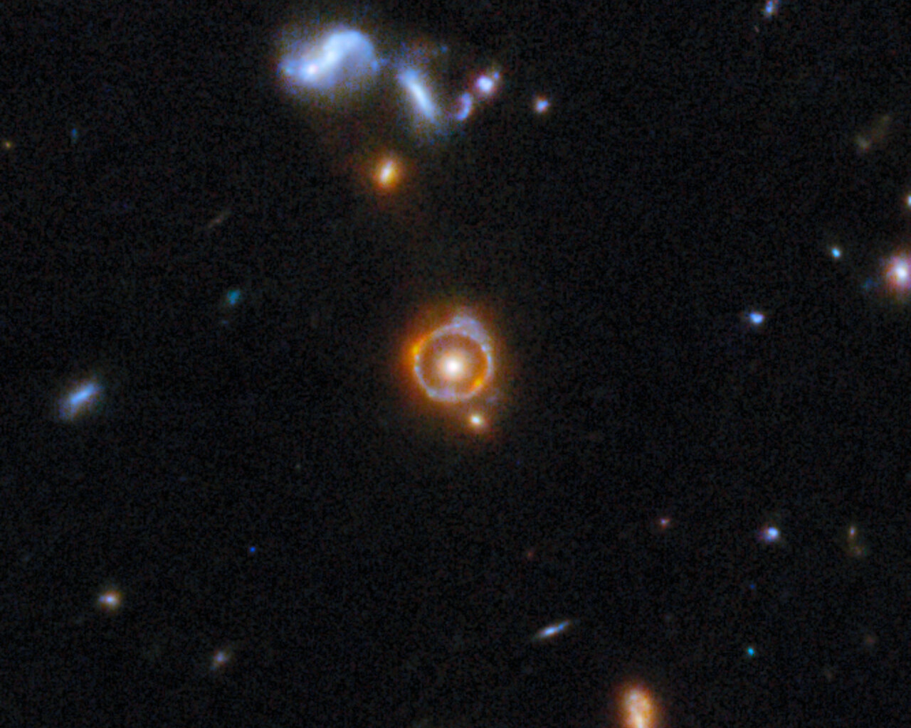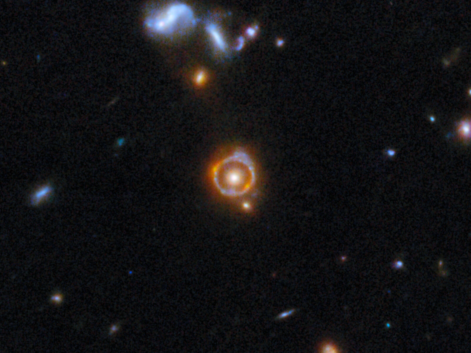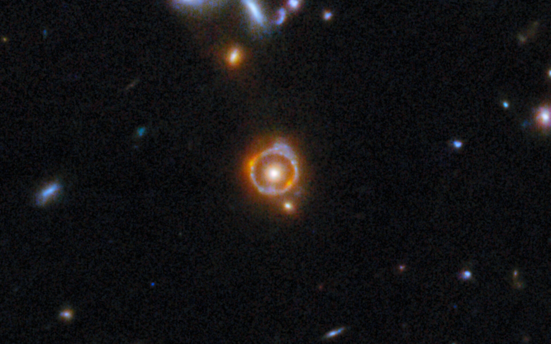 [Image Description: This image shows a deep galaxy field as seen by Webb, with a distinct gravitational lens at the centre. A central glowing galaxy in the foreground has a distorted background galaxy, in orange and blue hues, surrounding it in a circular shape.]