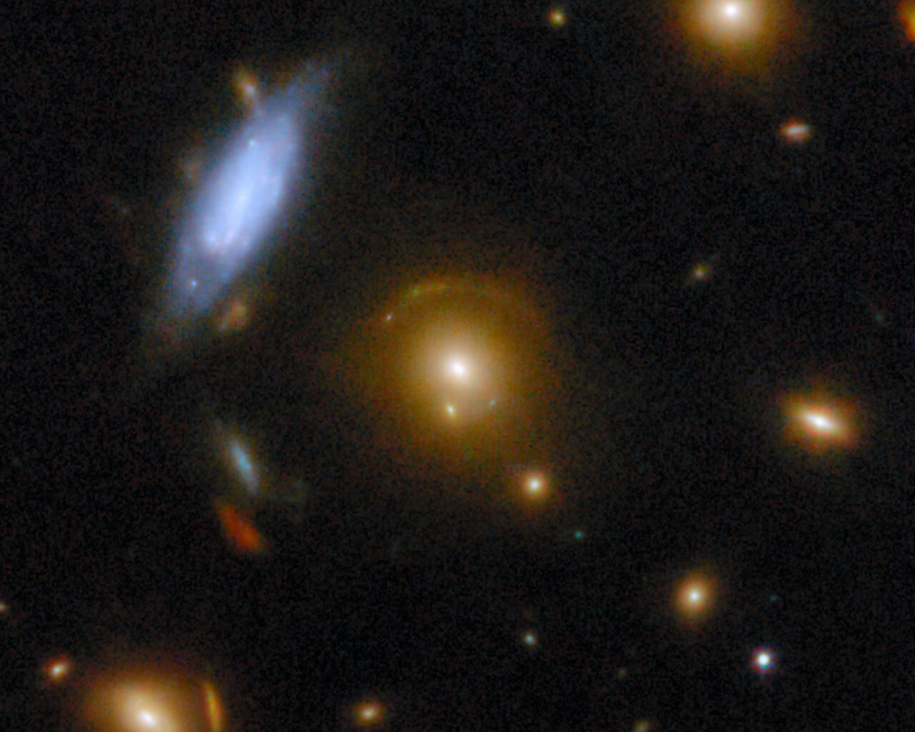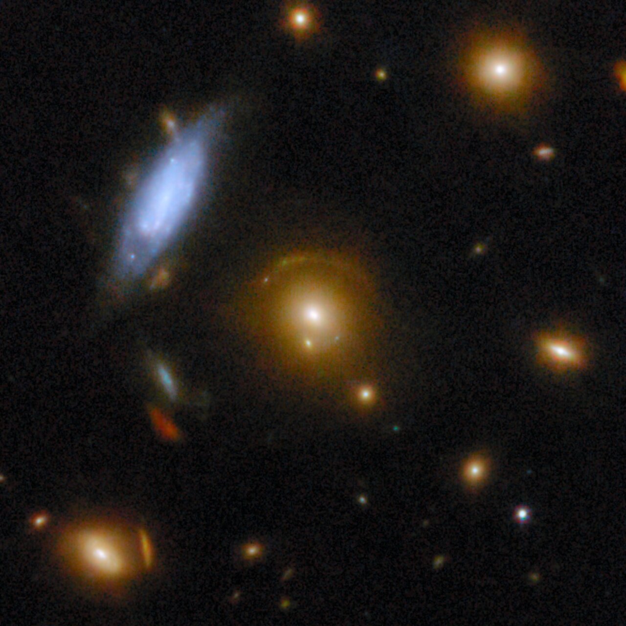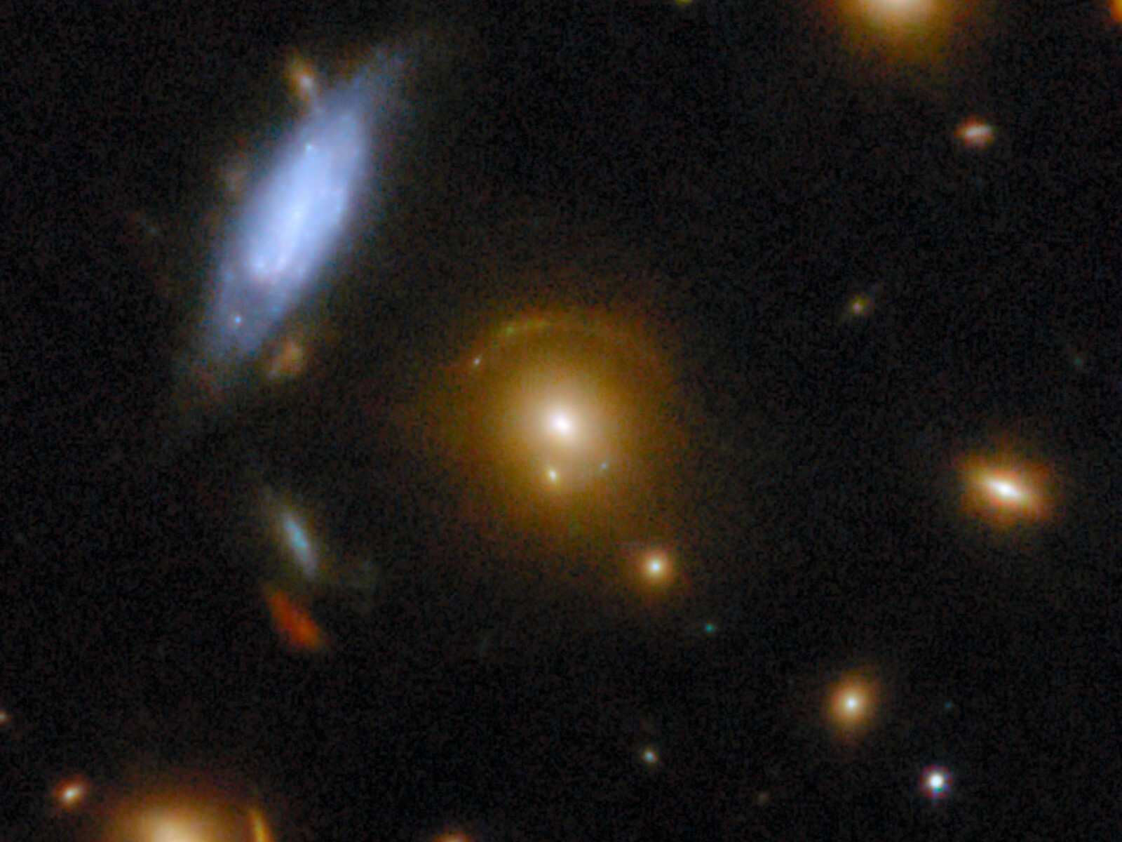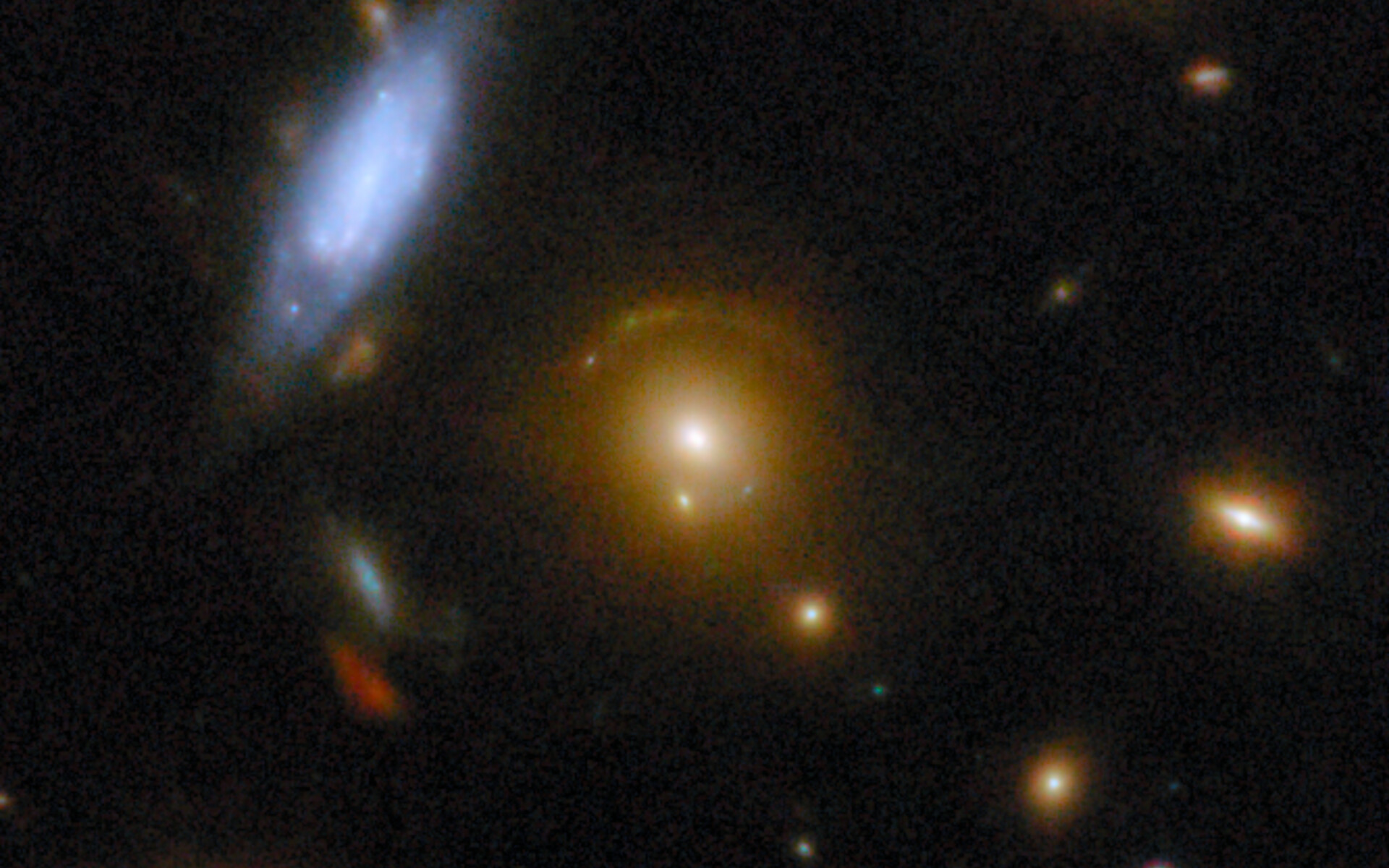The golden galaxy at the centre of the image is an elliptical galaxy whose immense gravity is bending the light from a more distant galaxy. The background galaxy is faintly visible as a golden arc along the top of the foreground galaxy.