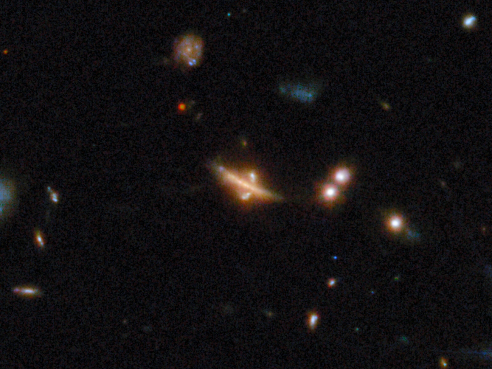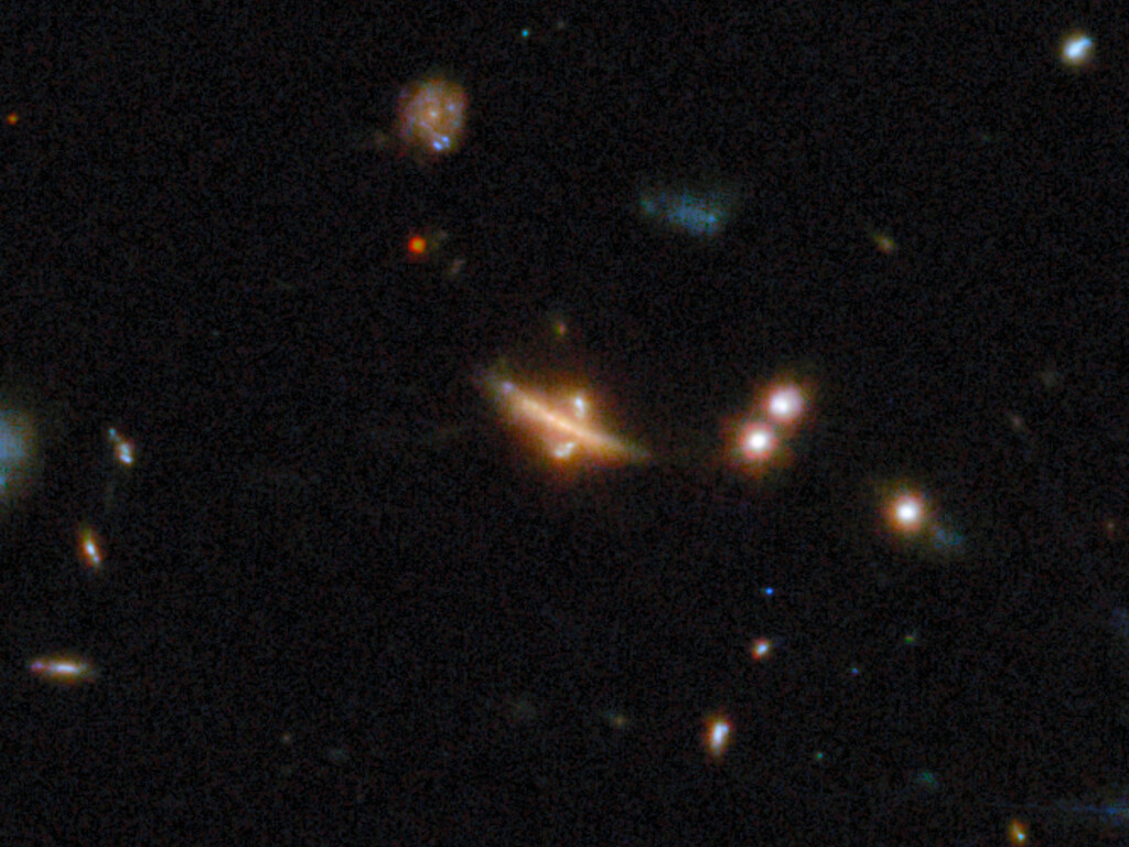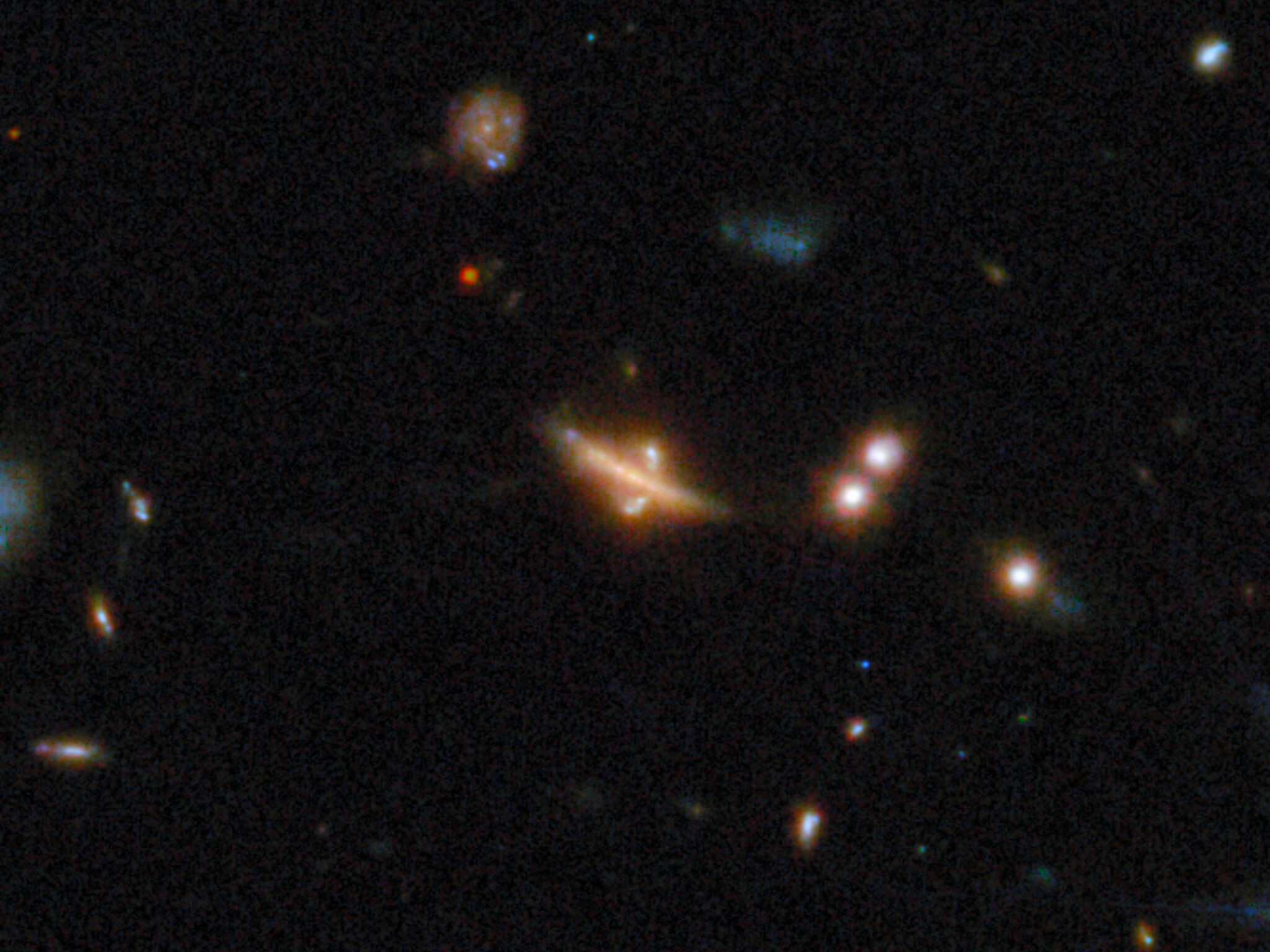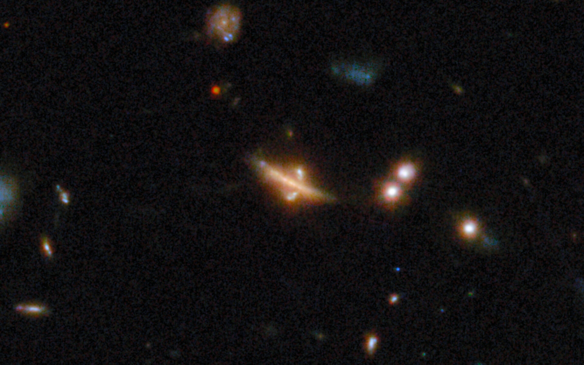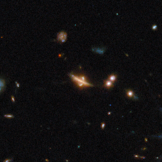 Somewhat resembling a ringed planet at first glance, this lens is markedly different from the others presented in the Picture of the Month compilation of gravitational lenses from the COSMOS-Web survey. This shows a rare case in which the lensing galaxy is a thin disc galaxy rather than a giant elliptical galaxy. The dust within the disc absorbs the source’s light, providing a valuable opportunity to study dust in very distant galaxies.