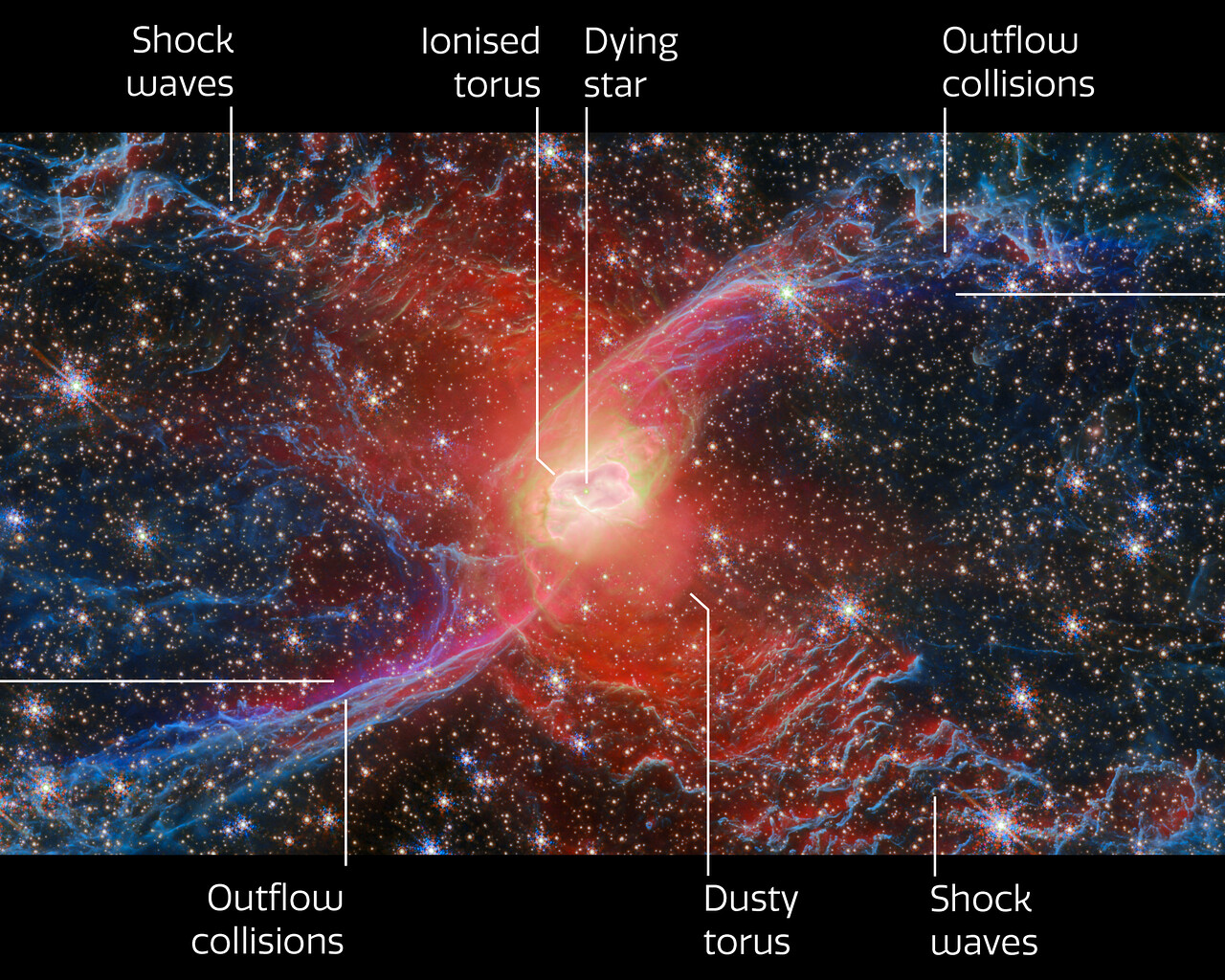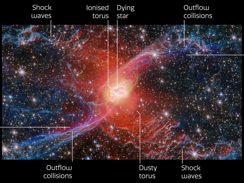 [Image Description: The central region of a planetary nebula is shown in a box. Labels indicate “Shock waves”, “Outflow collisions”, and an “Ionised jet” in the dust on both sides of the nebula. Close to the centre, “Dusty torus” and “Ionised torus” are marked. In the very middle, a faint dot inside a blotchy pink cloud is labelled “Dying star”. Bright stars surround the nebula and can be seen through the dust layers.]