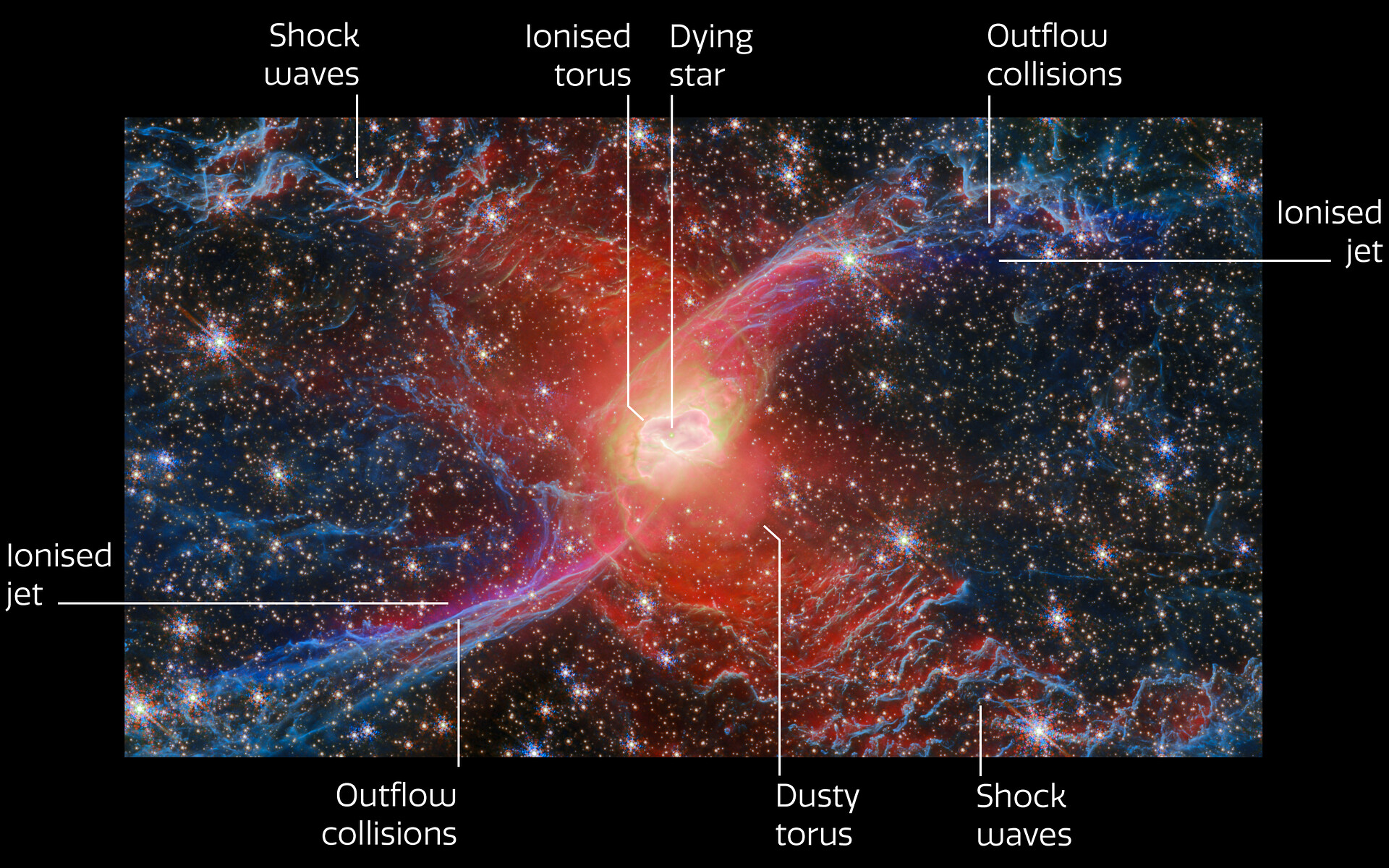 The rumpled appearance of the gas that forms the spider’s ‘legs’ comes from the interaction between outflows that emerge from opposite sides of the star and material that is swept up by the outflowing gas, creating shock waves. Webb’s view reveals for the first time the full extent of the nebula’s outstretched lobes.