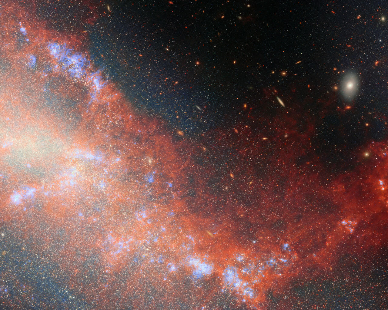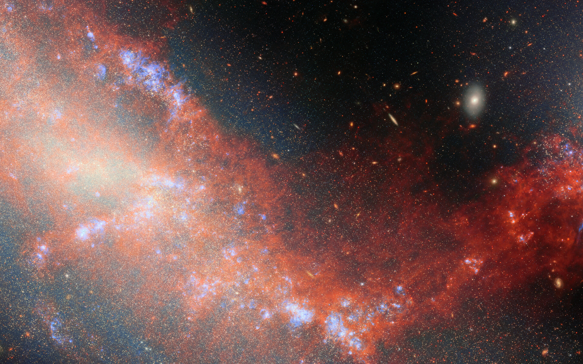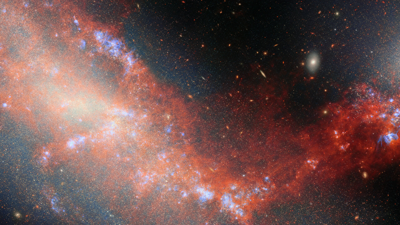 This image was developed using data from Webb’s Near-InfraRed Camera (NIRCam) and Mid-InfraRed Instrument (MIRI), as well as a single narrow-band filter from Hubble (657N). It reveals NGC 4490 and NGC 4485 in never-before-seen detail and illuminates the bridge of gas and stars that connects them. NGC 4490 dominates the image as the larger object occupying the left side of the image, while NGC 4485 is the smaller galaxy that hosts the top-right portion of the image. By dissecting these galaxies star by star, researchers were able to map out where young, middle-aged, and old stars reside, and trace the timeline of the galaxies’ interaction.