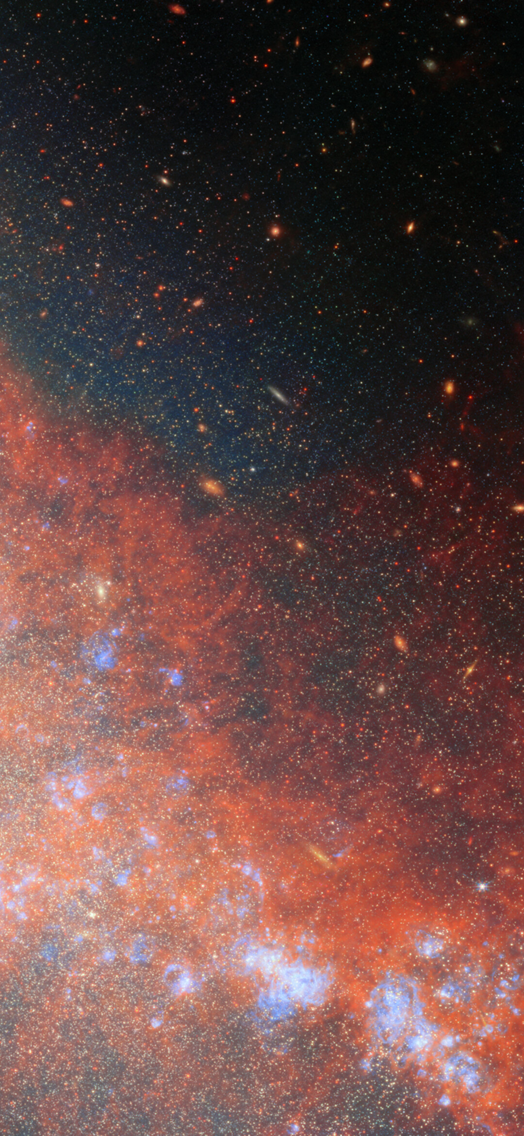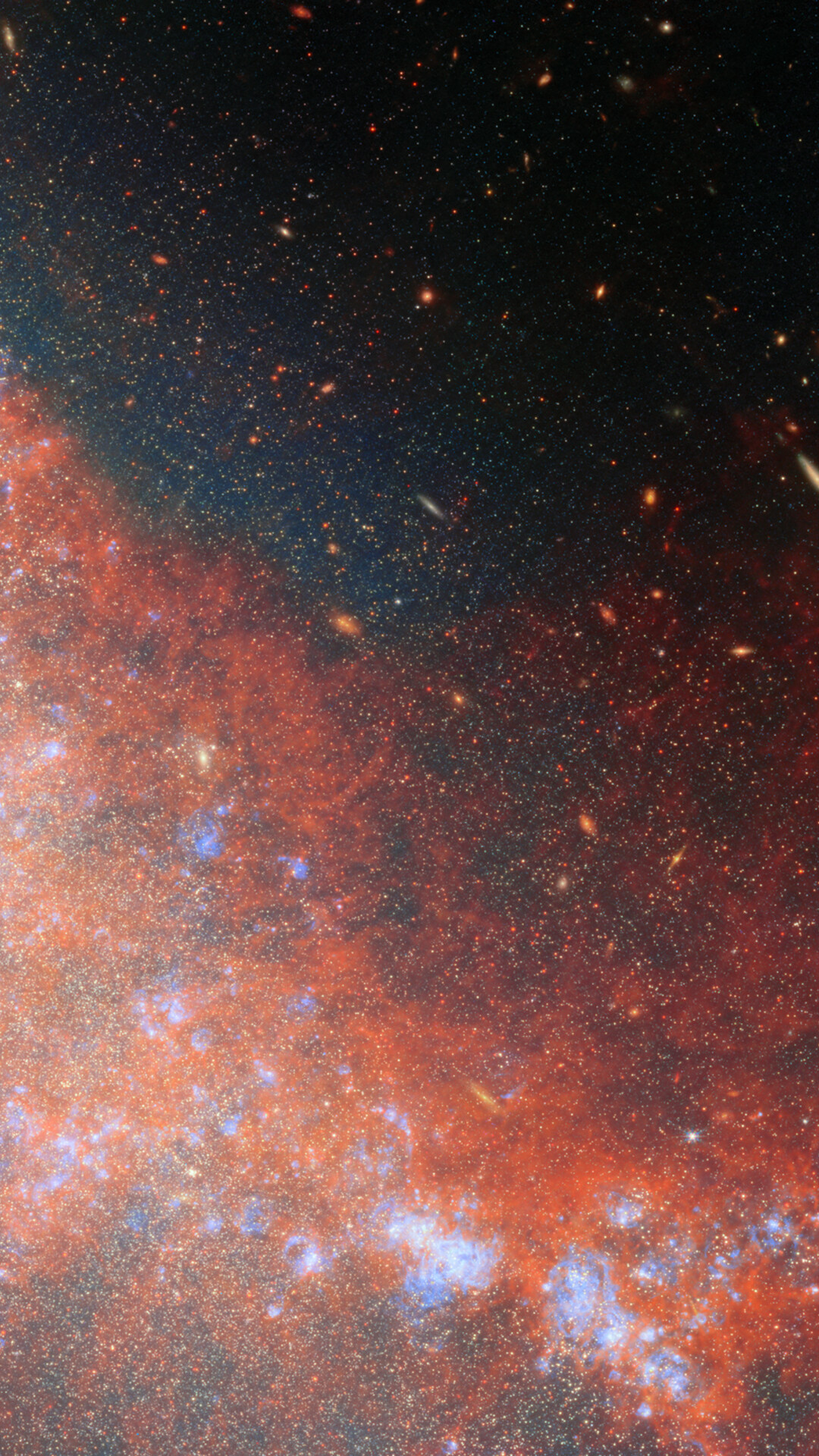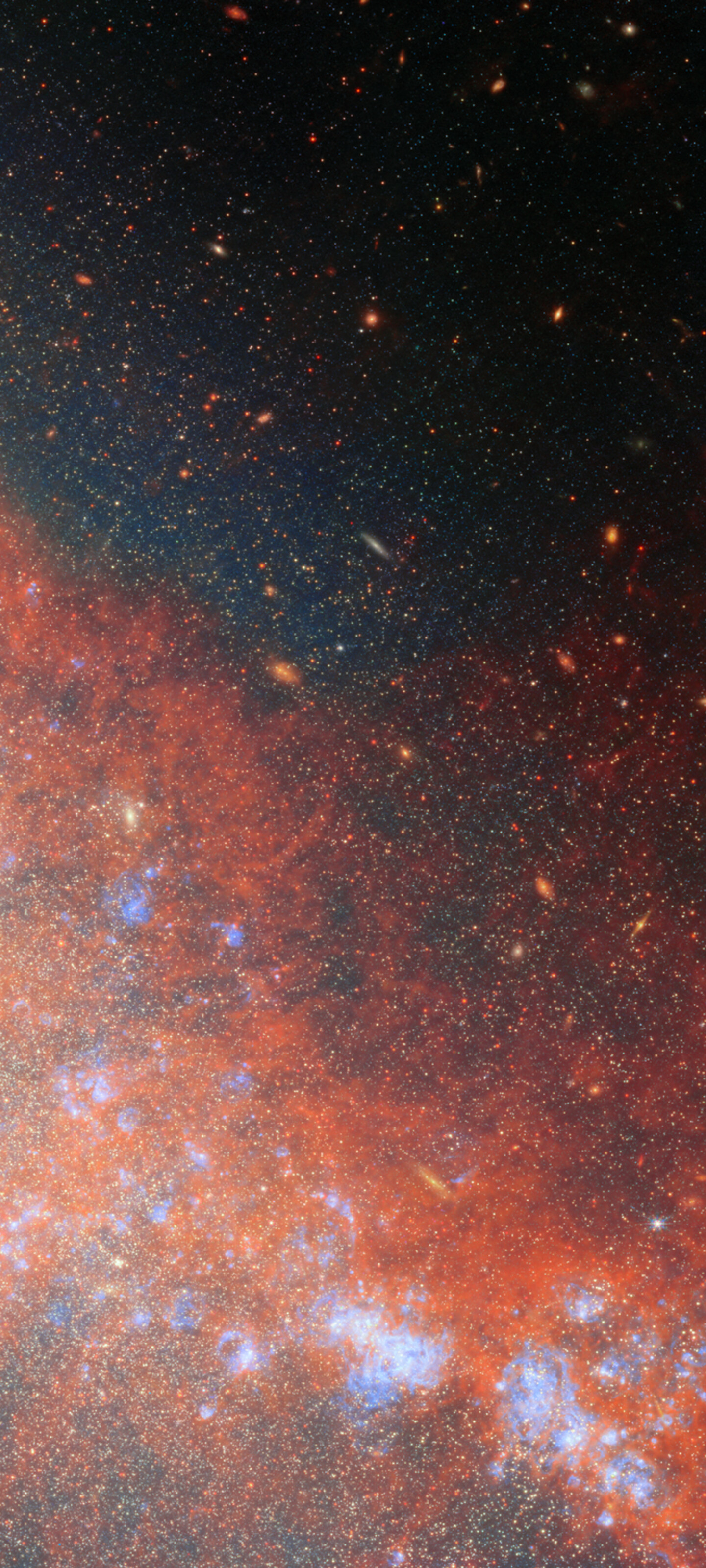 This image was developed using data from Webb’s Near-InfraRed Camera (NIRCam) and Mid-InfraRed Instrument (MIRI), as well as a single narrow-band filter from Hubble (657N). It reveals NGC 4490 and NGC 4485 in never-before-seen detail and illuminates the bridge of gas and stars that connects them. NGC 4490 dominates the image as the larger object occupying the left side of the image, while NGC 4485 is the smaller galaxy that hosts the top-right portion of the image. By dissecting these galaxies star by star, researchers were able to map out where young, middle-aged, and old stars reside, and trace the timeline of the galaxies’ interaction.
