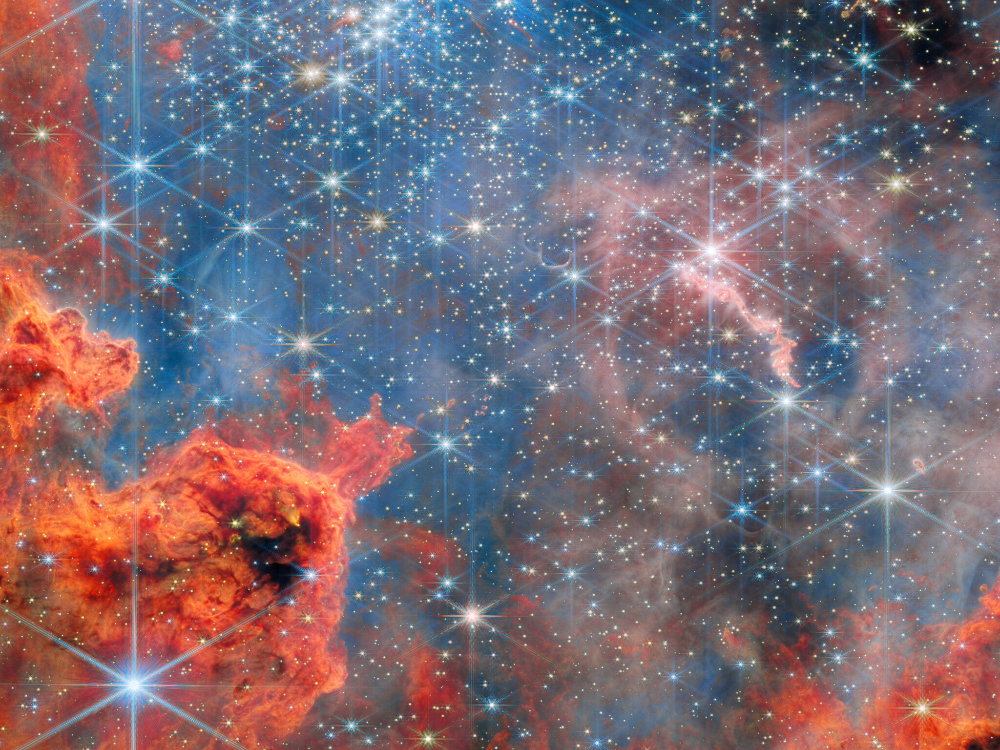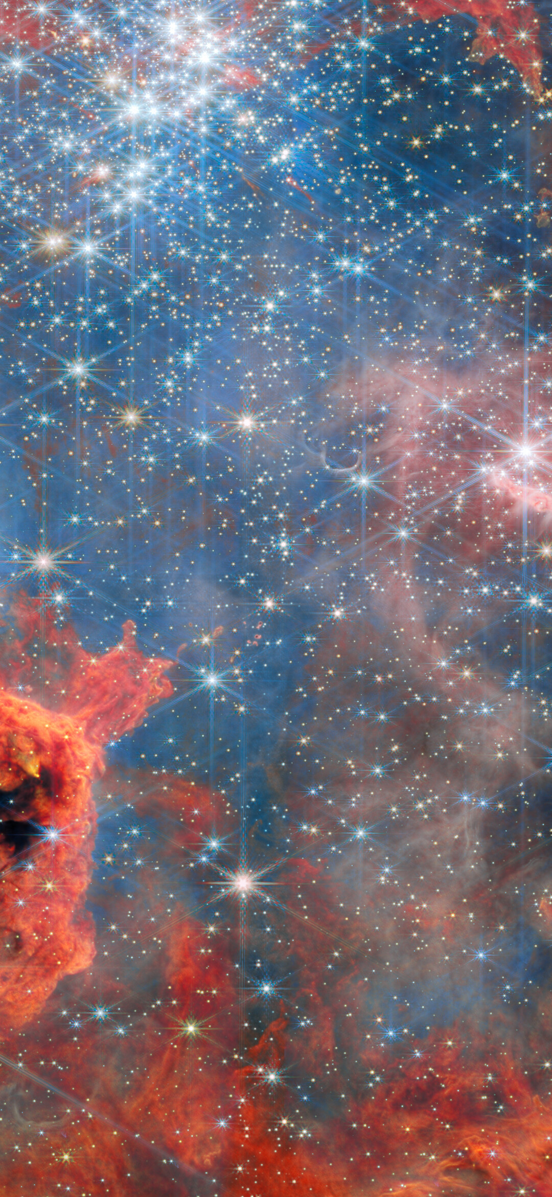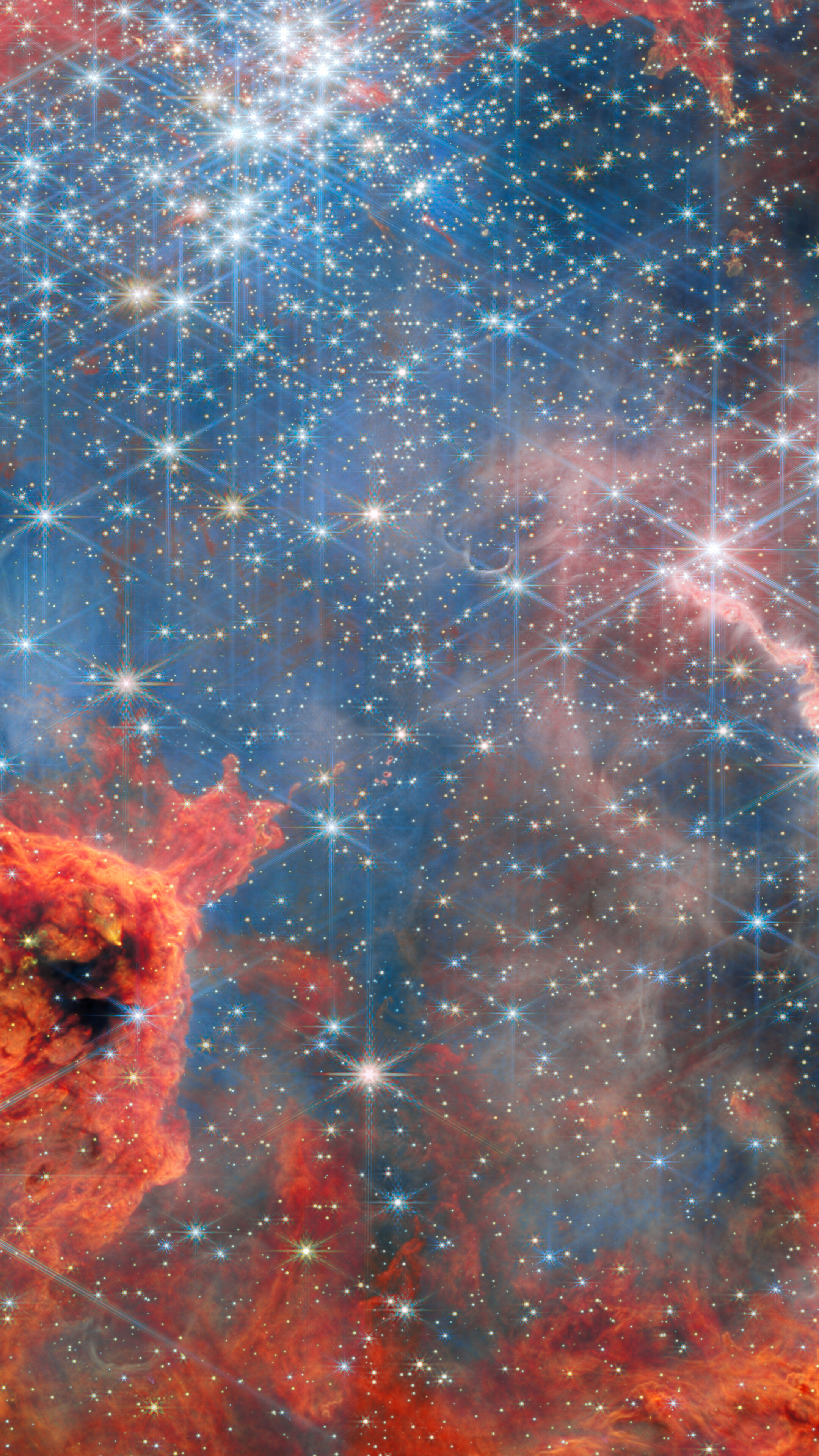 This new Webb image captures the bright, brilliant cluster near the top that is packed with young, massive stars whose intense light shapes the entire scene. Below and around them, swirls of orange and red gas form sculpted walls and tangled clouds - material that is being pushed, eroded, and illuminated by the cluster’s powerful radiation. Threaded throughout the view are countless tiny stars just beginning to shine, some still surrounded by the gas and dust from which they formed. The soft blues and pinks are wisps of thinner material drifting between the denser clouds. Scattered across the field are also many bright stars much closer to us, whose sharp, star-shaped patterns are created by Webb’s optics. The result is a vivid portrait of a stellar nursery in action, where intense energy from newborn stars carves dramatic shapes into the surrounding nebula and drives the ongoing cycle of star formation.