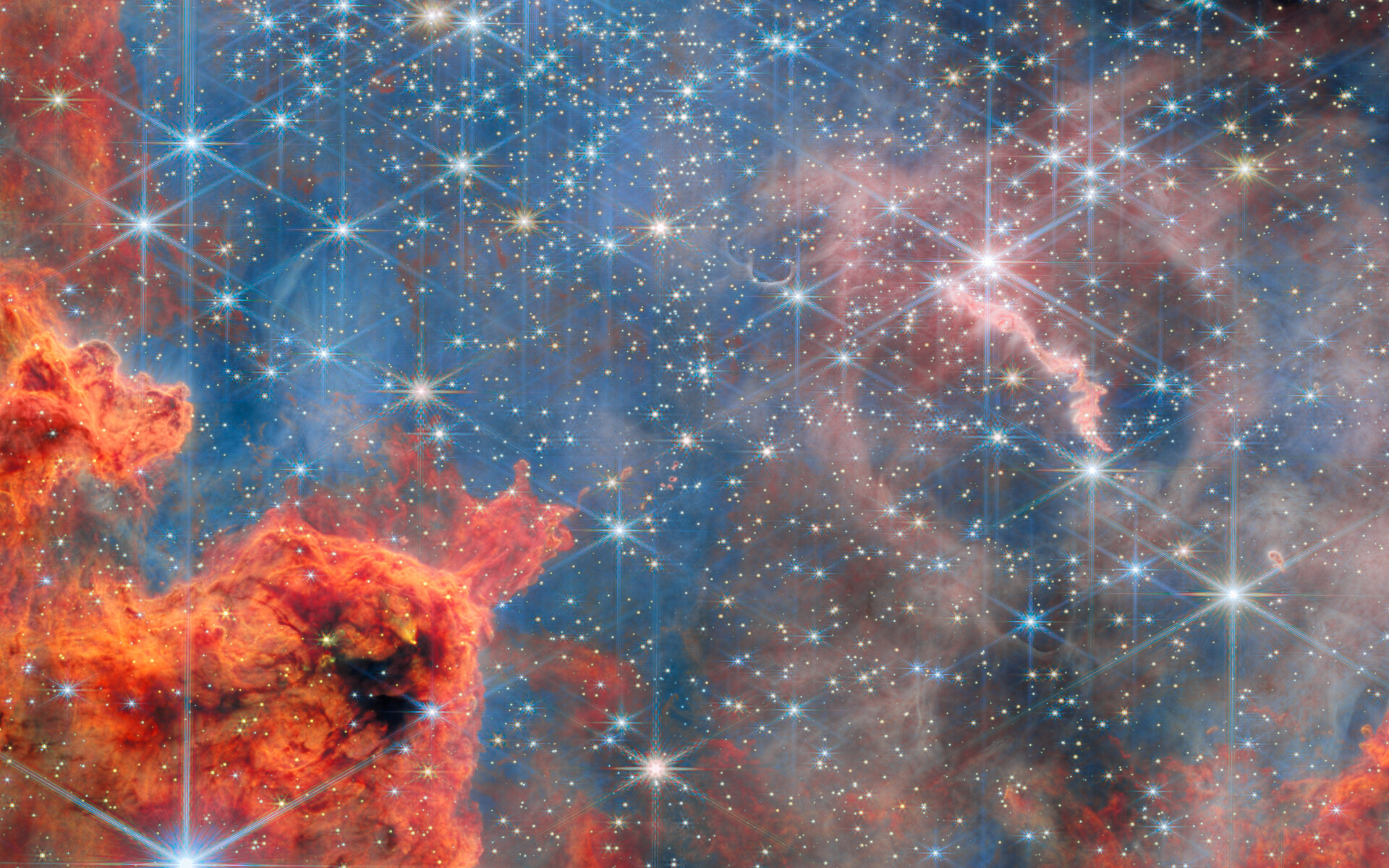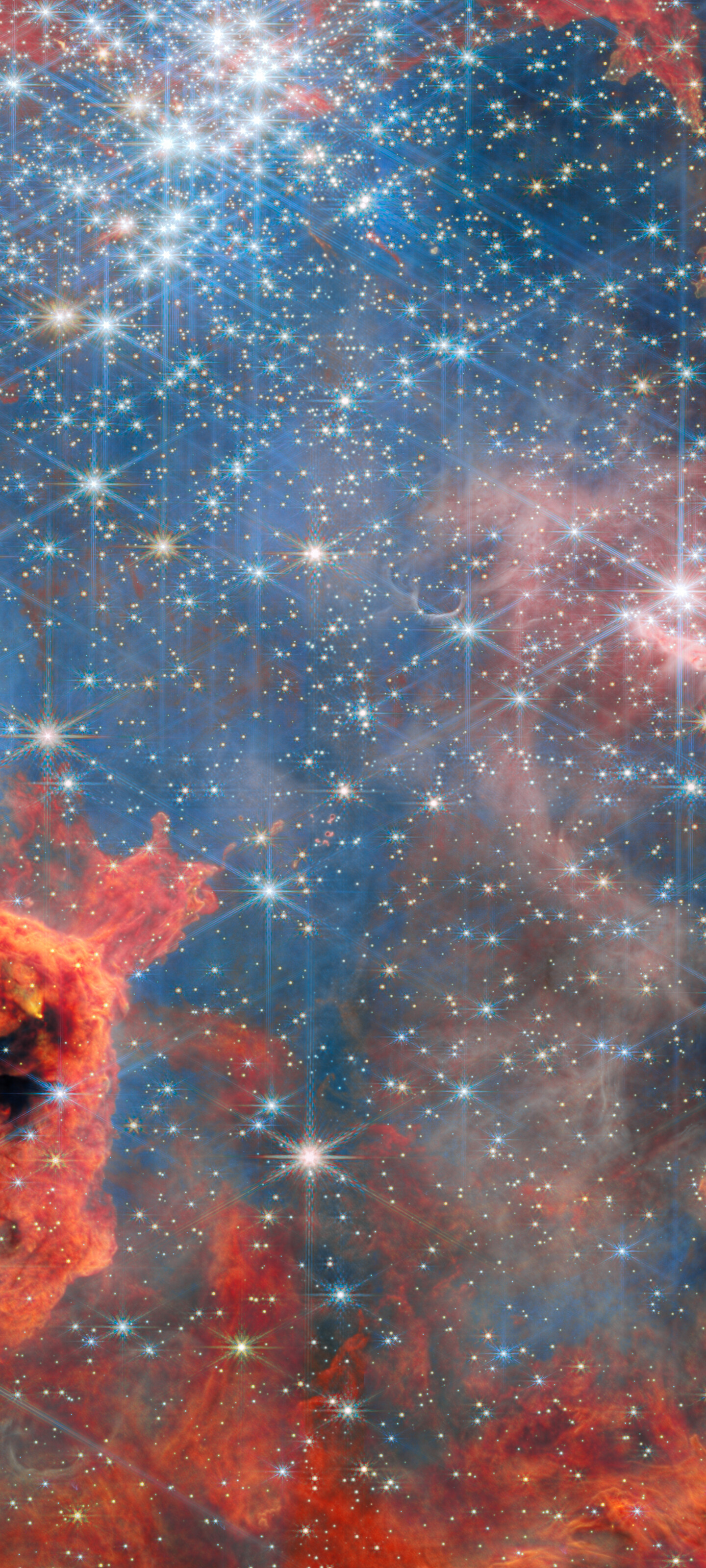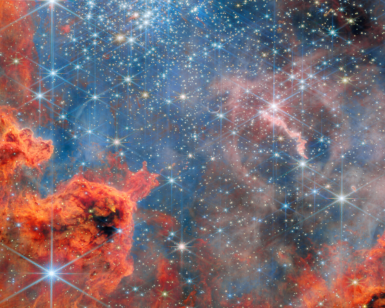 This new Webb image captures the bright, brilliant cluster near the top that is packed with young, massive stars whose intense light shapes the entire scene. Below and around them, swirls of orange and red gas form sculpted walls and tangled clouds - material that is being pushed, eroded, and illuminated by the cluster’s powerful radiation. Threaded throughout the view are countless tiny stars just beginning to shine, some still surrounded by the gas and dust from which they formed. The soft blues and pinks are wisps of thinner material drifting between the denser clouds. Scattered across the field are also many bright stars much closer to us, whose sharp, star-shaped patterns are created by Webb’s optics. The result is a vivid portrait of a stellar nursery in action, where intense energy from newborn stars carves dramatic shapes into the surrounding nebula and drives the ongoing cycle of star formation.