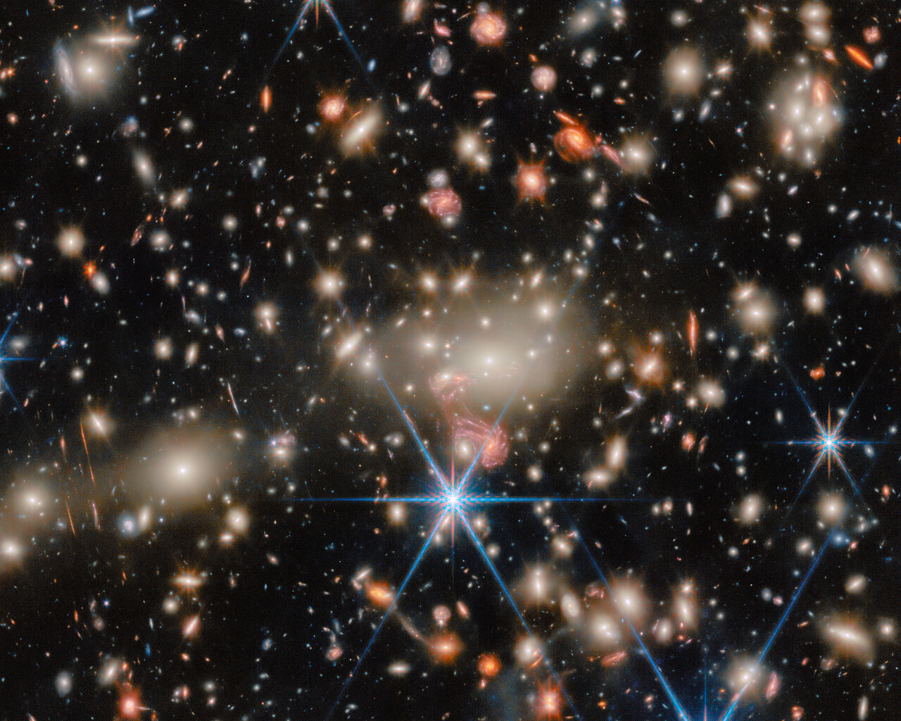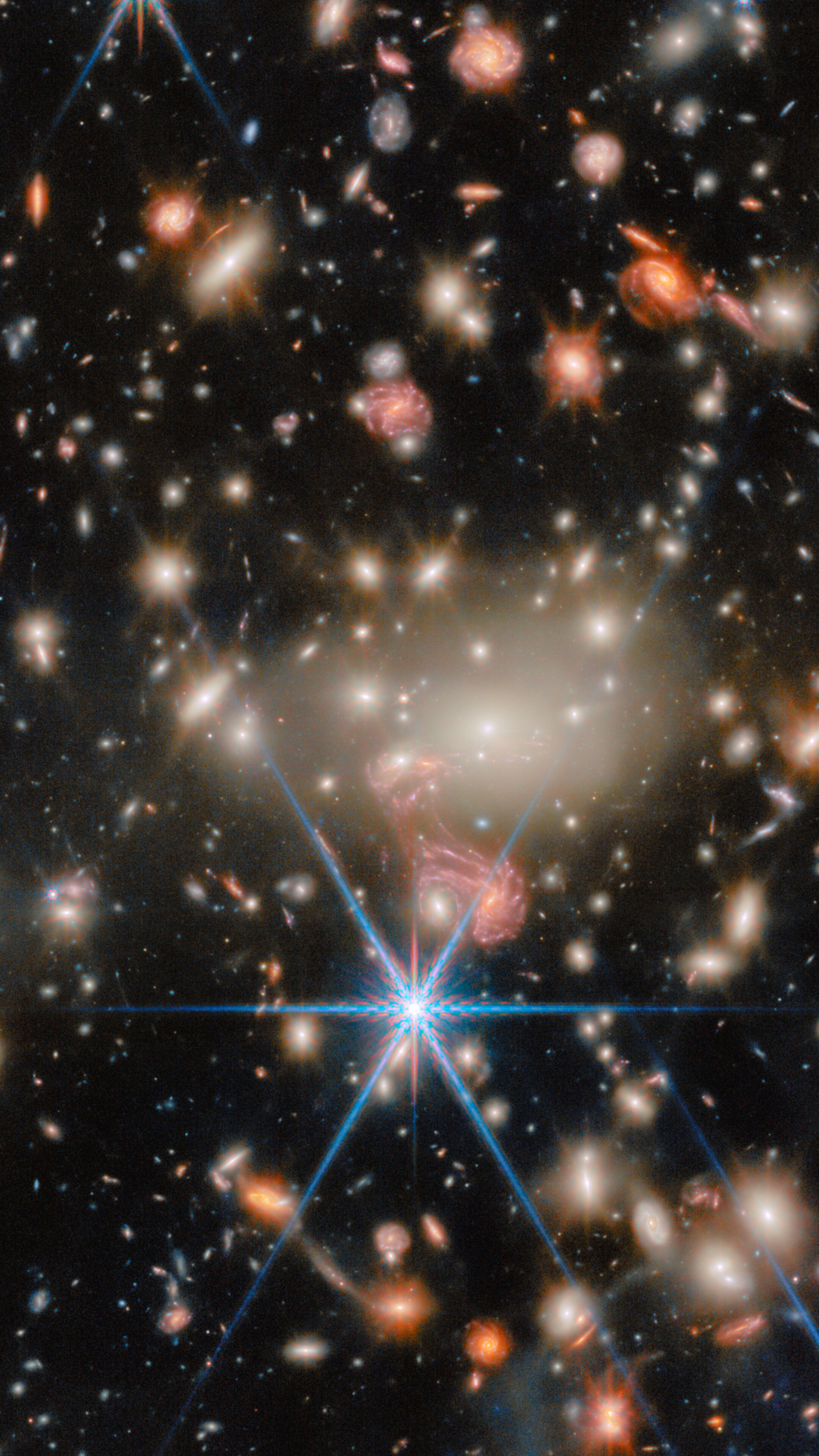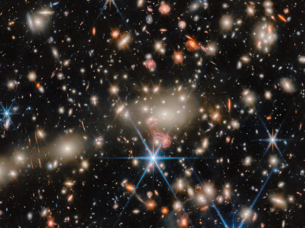 A fantastic example of gravitational lensing can be seen near the centre of the image, just below the brilliant white galaxies at the heart of the cluster. There, the image of a galaxy with distinct spiral arms has been stretched into something resembling a pink jellyfish. This tangled-looking galaxy is home to what was once the most distant single star ever discovered as well as a supernova whose image appeared four times at once.