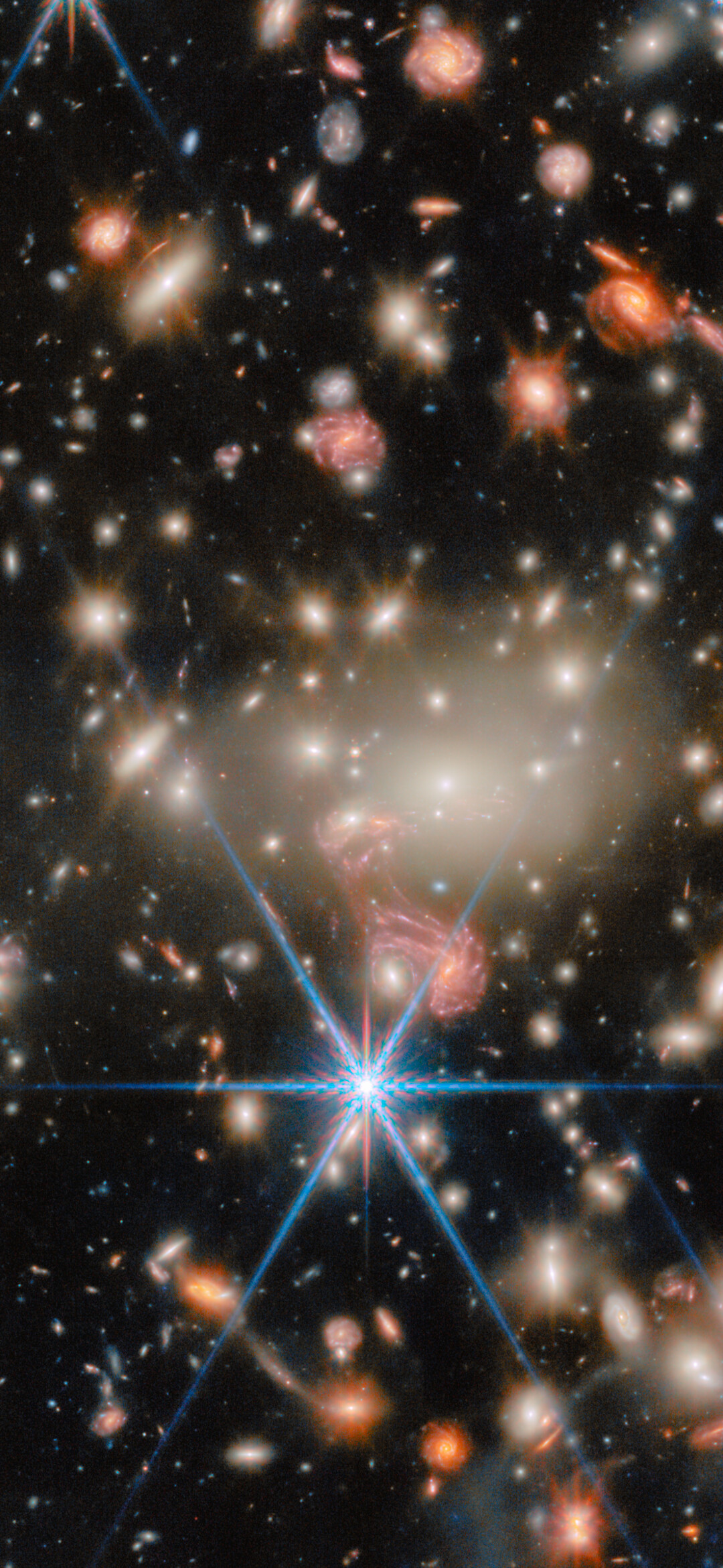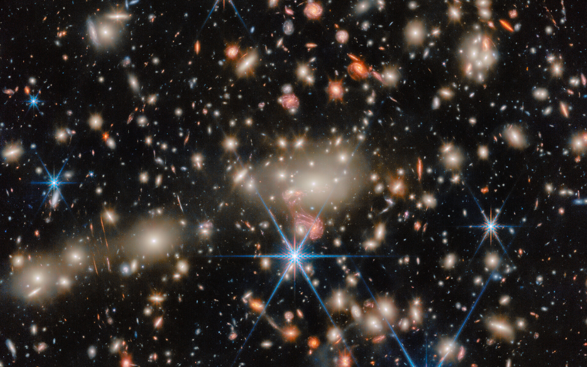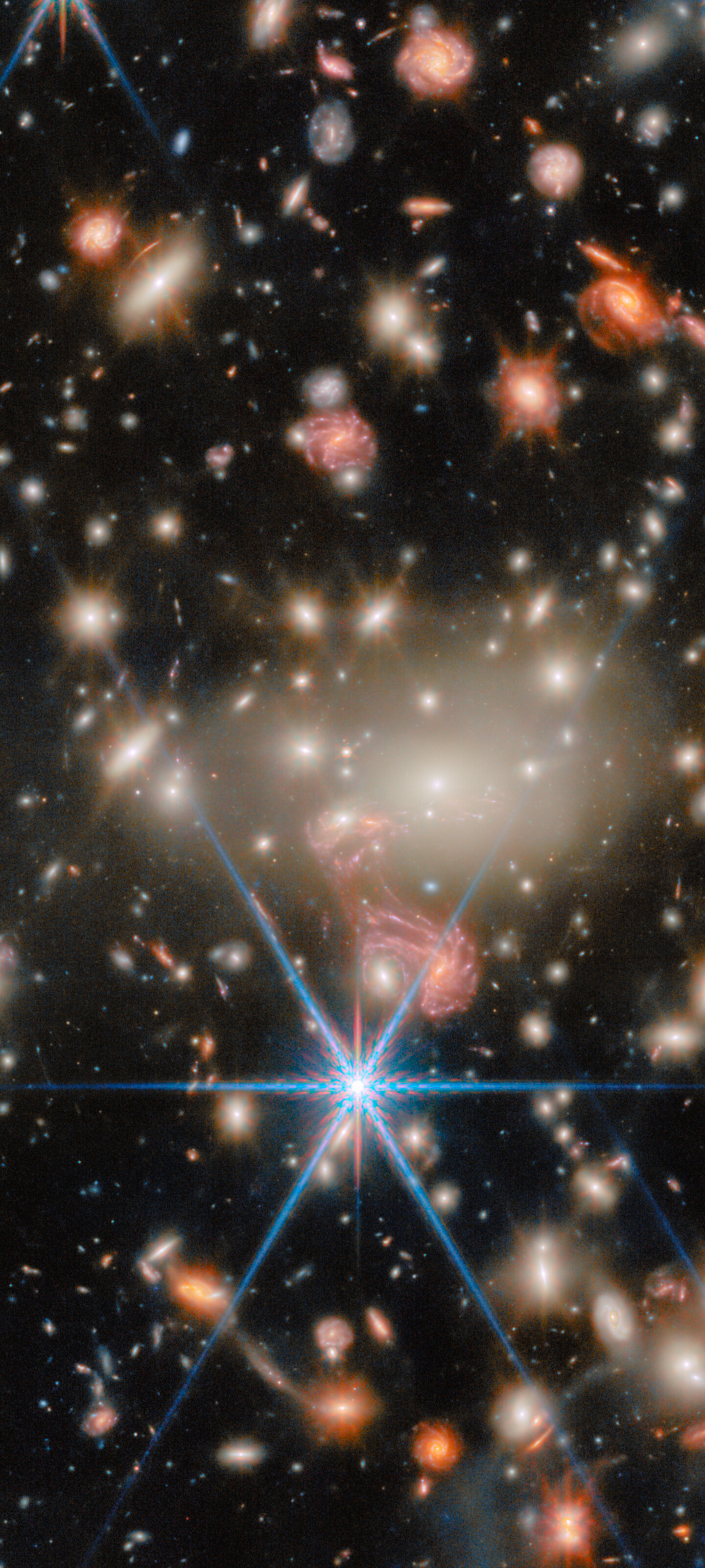 A fantastic example of gravitational lensing can be seen near the centre of the image, just below the brilliant white galaxies at the heart of the cluster. There, the image of a galaxy with distinct spiral arms has been stretched into something resembling a pink jellyfish. This tangled-looking galaxy is home to what was once the most distant single star ever discovered as well as a supernova whose image appeared four times at once.