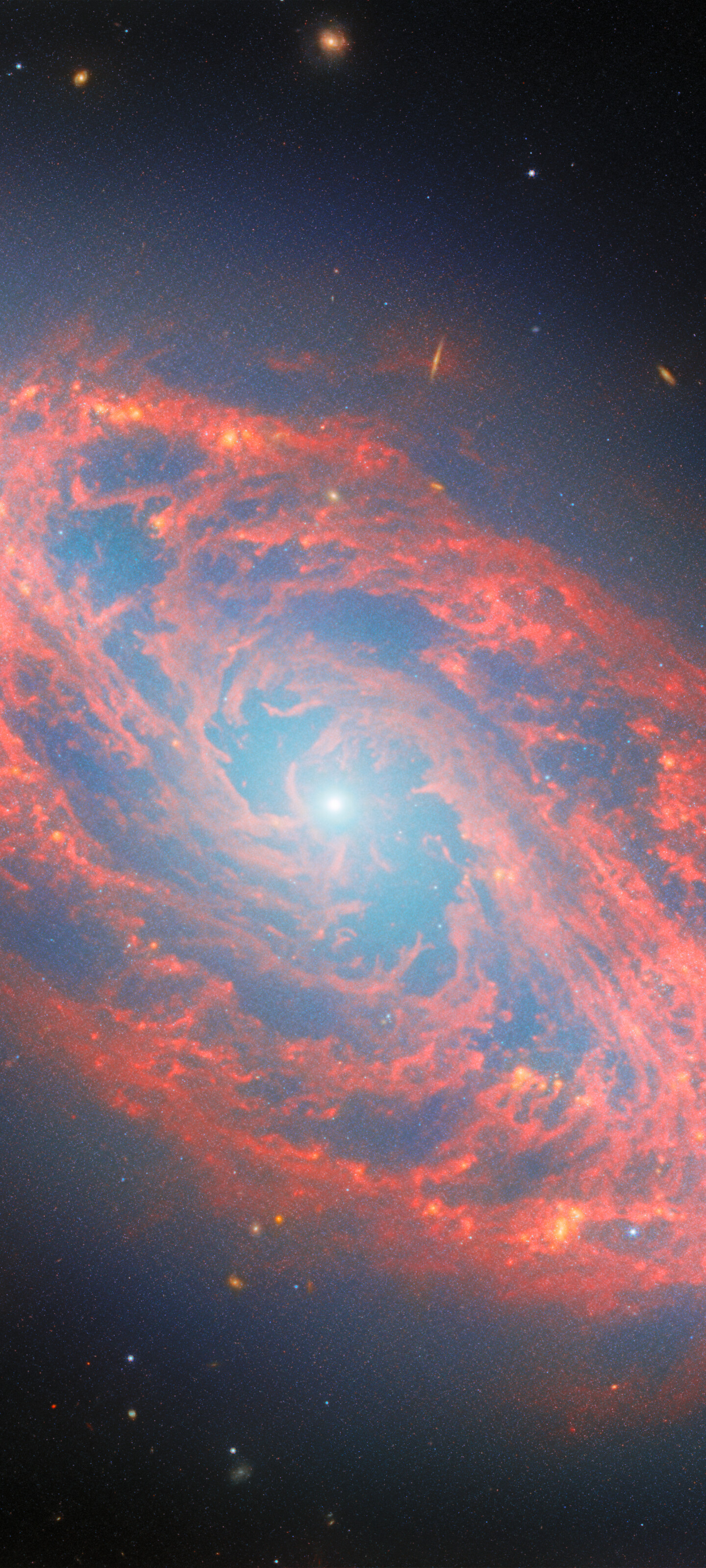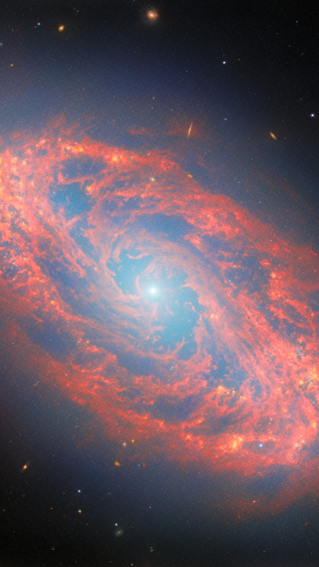 [Image Description: A spiral galaxy, seen tilted diagonally. It has a blue-white, glowing spot at its core. Its oval-shaped disc glows faintly blue throughout with light from its many stars. The disc is filled with waves and strands of bright red dust that swirl around the core. At places there are holes torn in the dust, while elsewhere it forms dense clumps that glow orange. Several tiny, distant galaxies appear across the background.]
