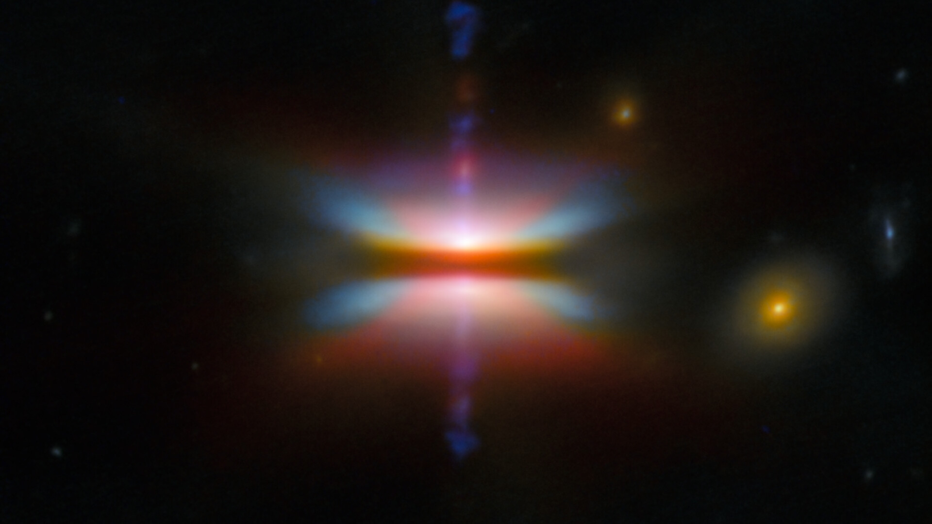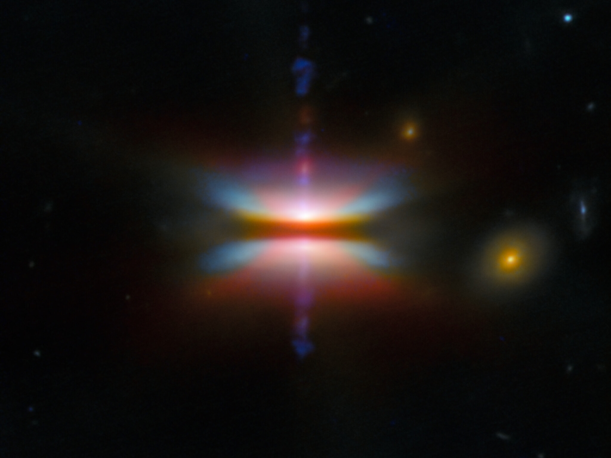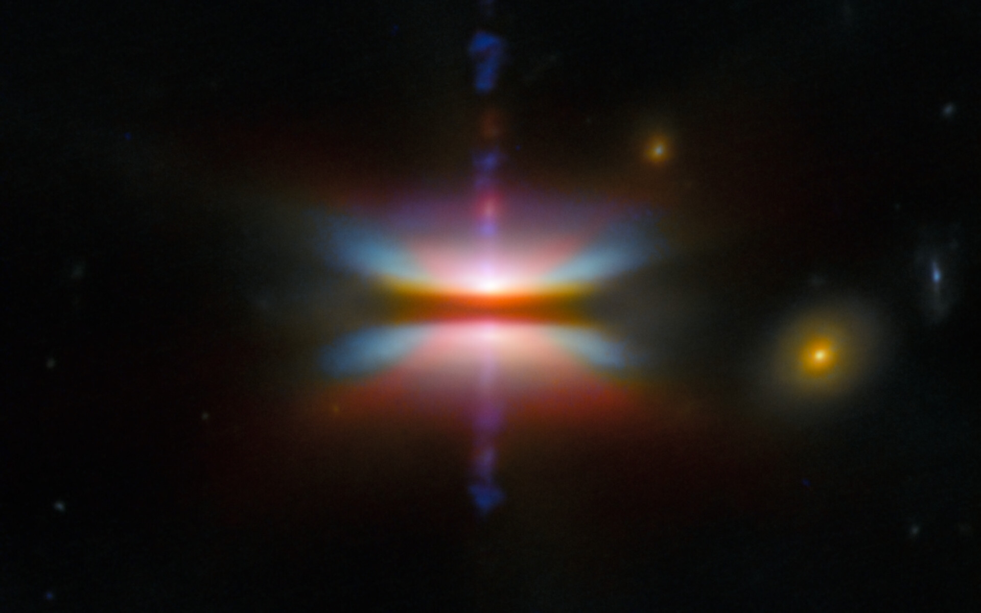 Above and below the dark band, the dust grains gradually become smaller and smaller the farther out we look, to less than a millionth of a metre in size. They are lit by the central star, creating these colourful “wings” top and bottom. Different colours in the wings mark out different kinds of molecules, indexed by Webb’s keen infrared vision; the red areas forming a cross shape are thought to be part of a wind blowing hydrogen atoms and light molecules far out of the disc. Above and to the right of the disc, three distant galaxies appear in the background.