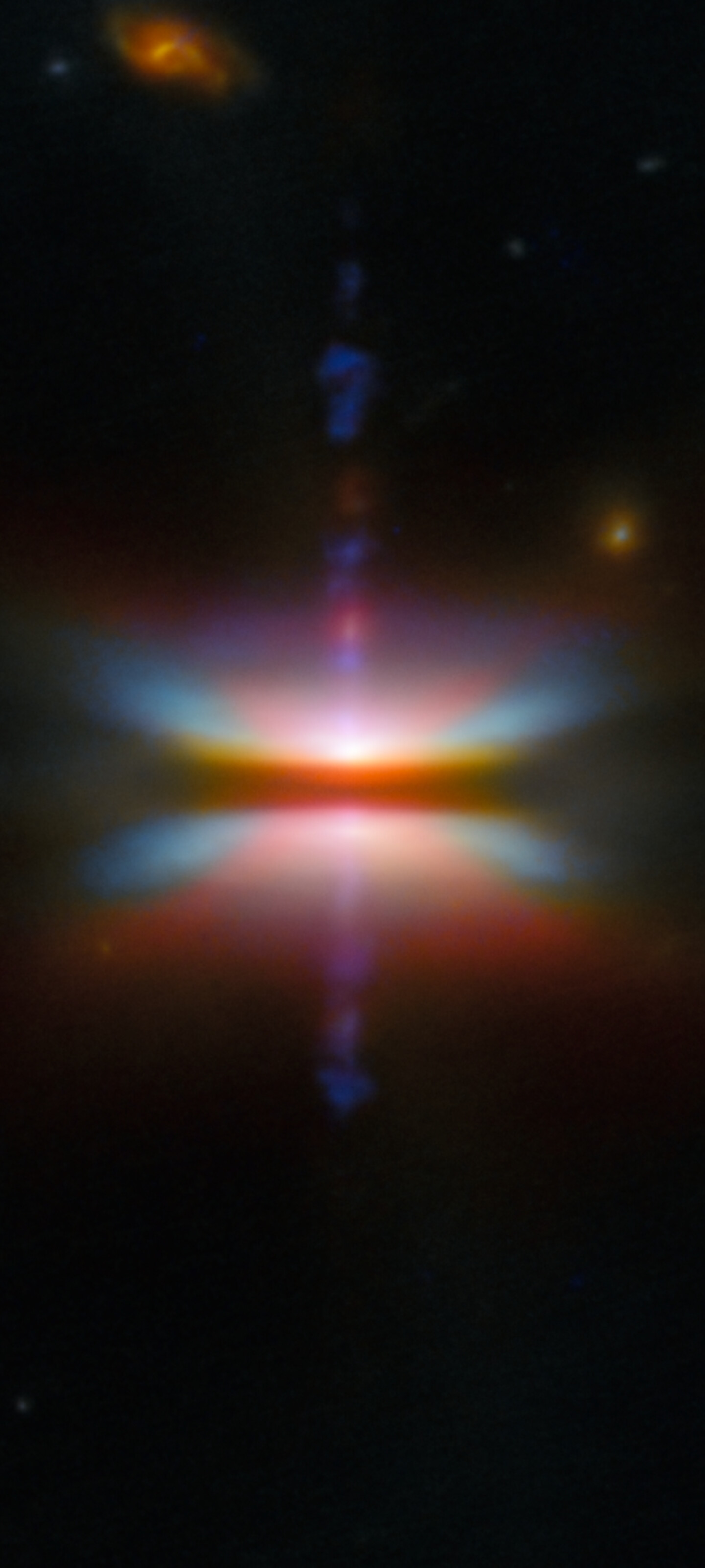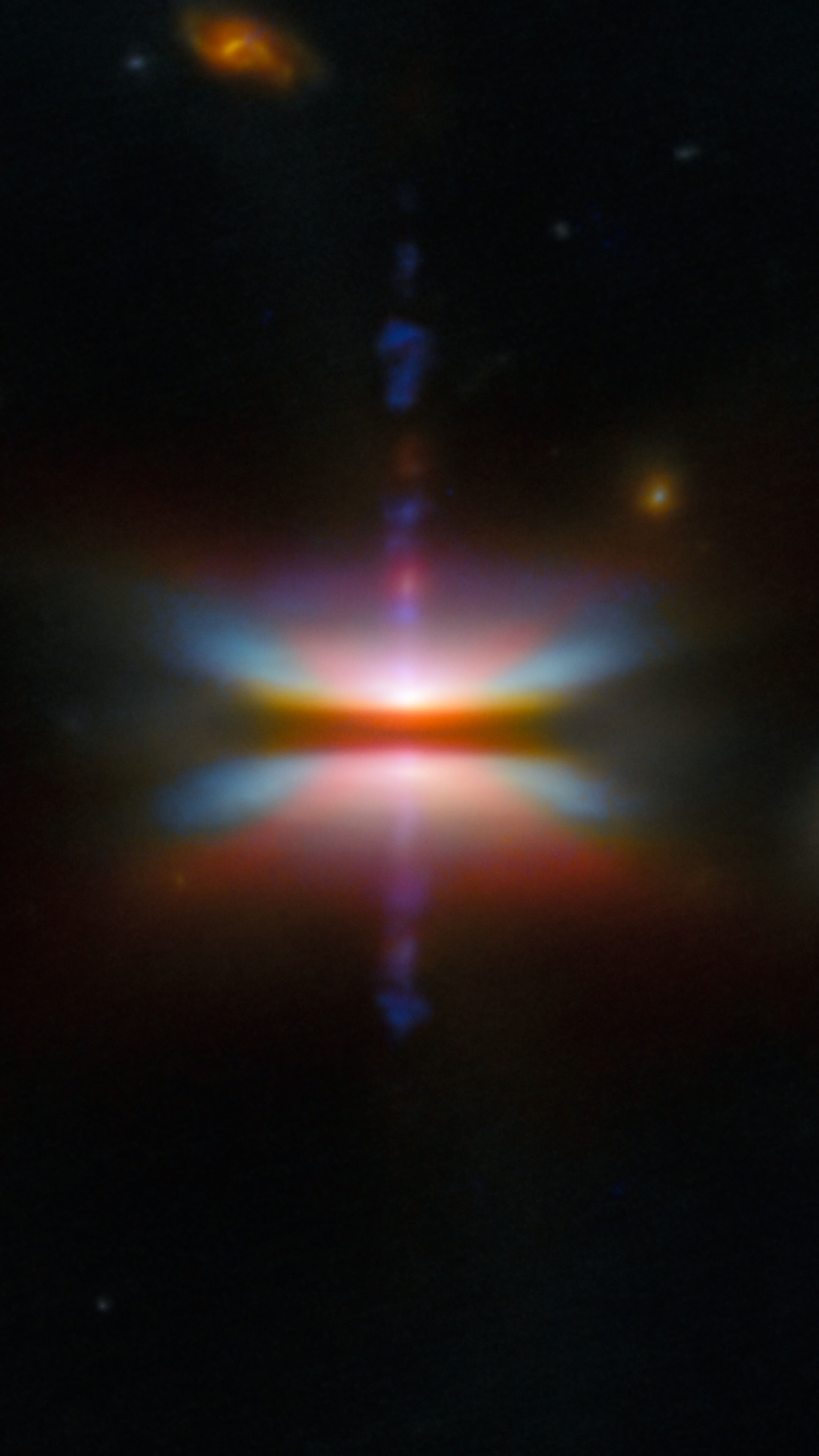 The detailed and eye-catching view shown here combines Webb’s images, taken with the Near-Infrared Camera NIRCam and the Mid-Infrared Imager MIRI, with visible-light data from the NASA/ESA Hubble Space Telescope. The knots in the jet that is perpendicular to the disc appear in different colours between the Hubble (bluer) and Webb (redder) images because of the motion of the jet in the 12 years between the observations.