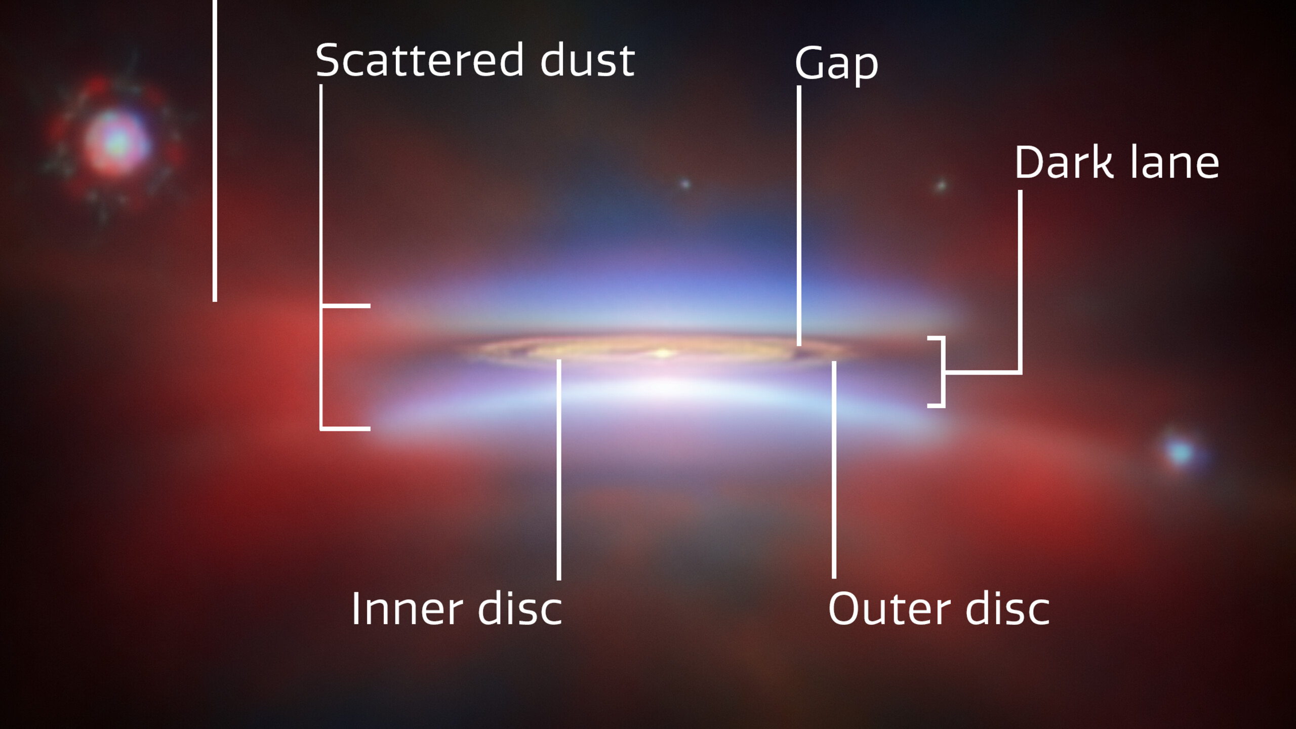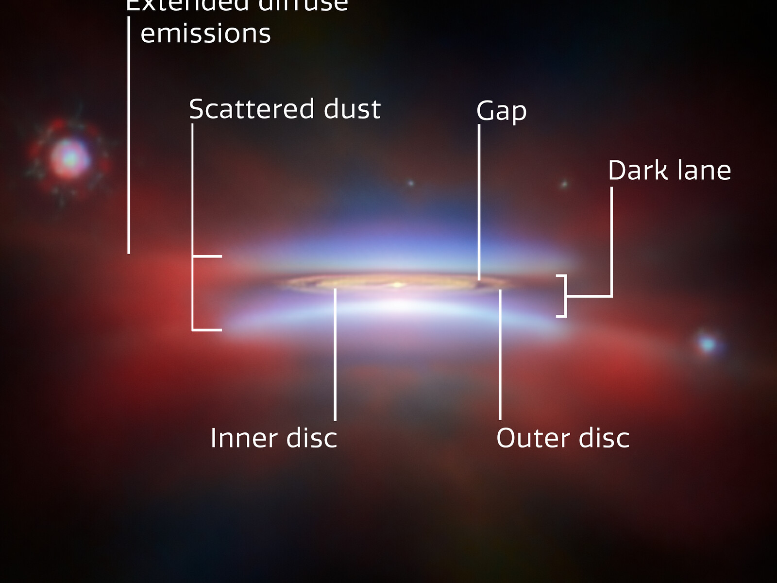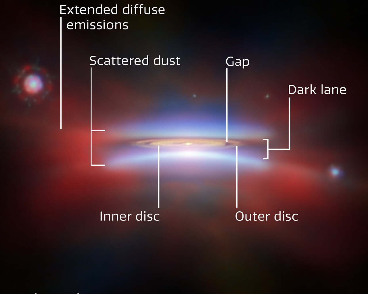 [Image Description: A close-up of protoplanetary disc Oph 163131. Parts of the disc are annotated with labels: “Scattered dust”, at top and bottom, “Dark lane” across the centre, and “Inner disc”, “Outer disc” and “Gap” in the middle of the disc. A red glow around the disc is labelled “Extended diffuse emissions”. In the bottom right there is a scale bar, labelled “100 au”. It is about a quarter as long as the disc is wide.]