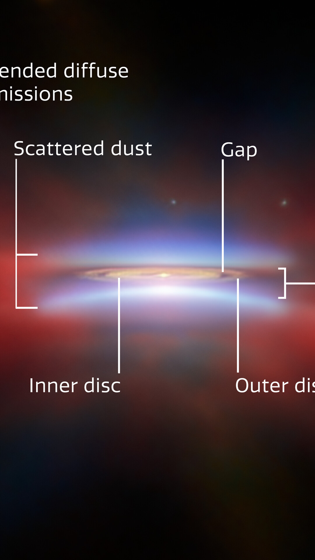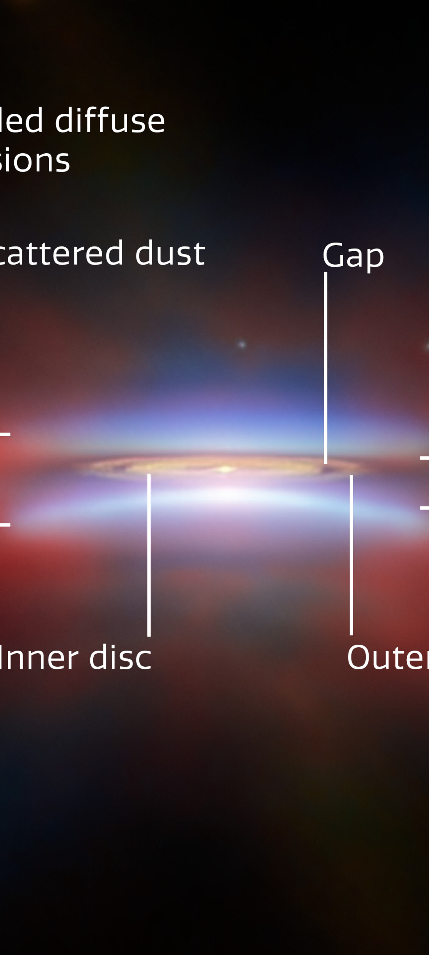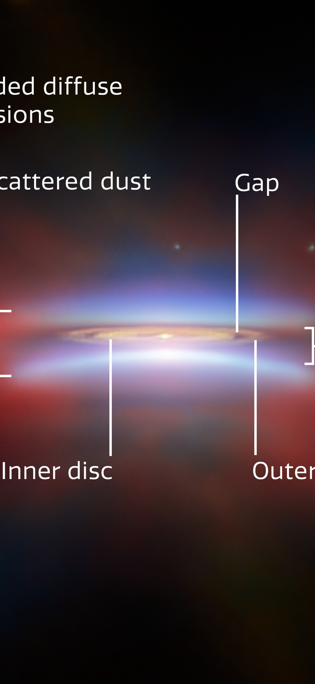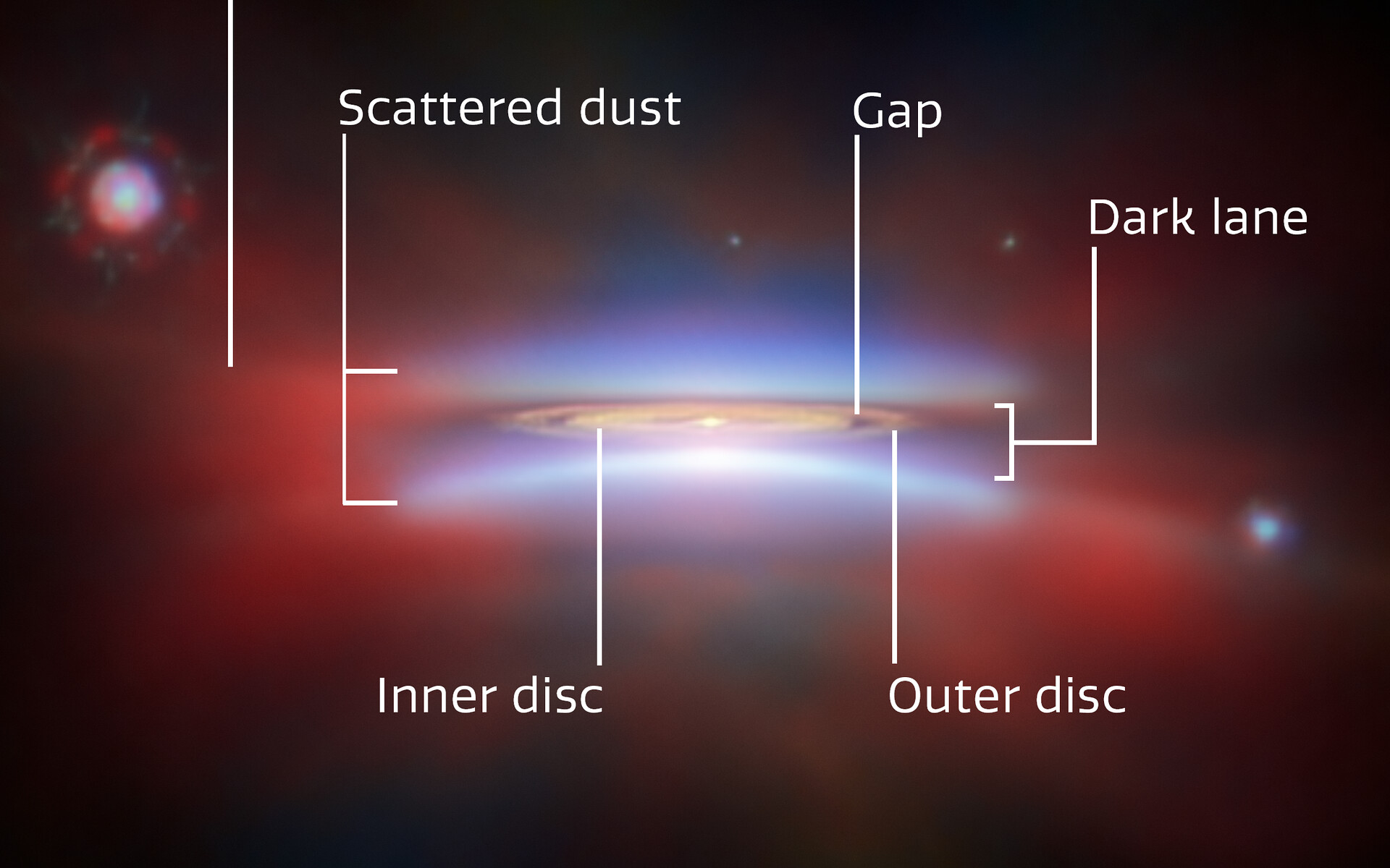 [Image Description: A close-up of protoplanetary disc Oph 163131. Parts of the disc are annotated with labels: “Scattered dust”, at top and bottom, “Dark lane” across the centre, and “Inner disc”, “Outer disc” and “Gap” in the middle of the disc. A red glow around the disc is labelled “Extended diffuse emissions”. In the bottom right there is a scale bar, labelled “100 au”. It is about a quarter as long as the disc is wide.]