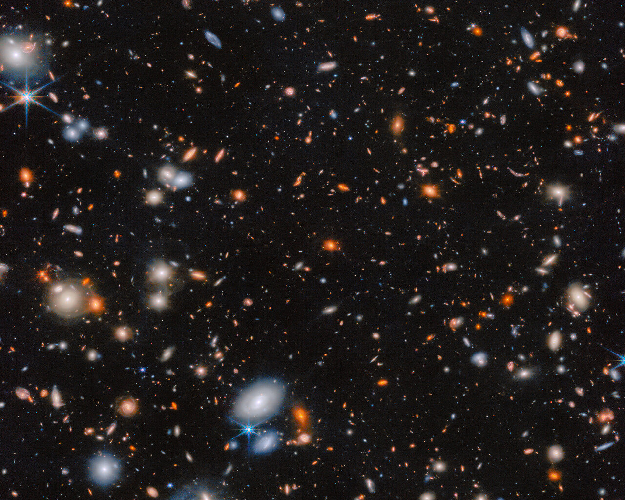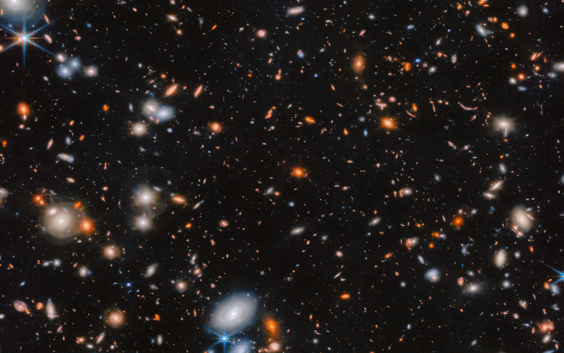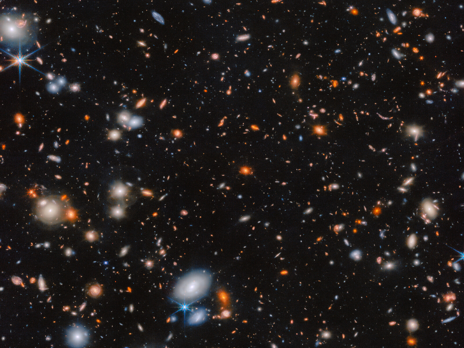 [Image description: An image of many glowing galaxies in deep space, in various shapes and colours, on a black background. There are some large, blue spiral galaxies, some large and pale white elliptical galaxies, and many orange and red, medium-sized galaxies. Even smaller galaxies, down to tiny faint spots, appear in all these colours.]