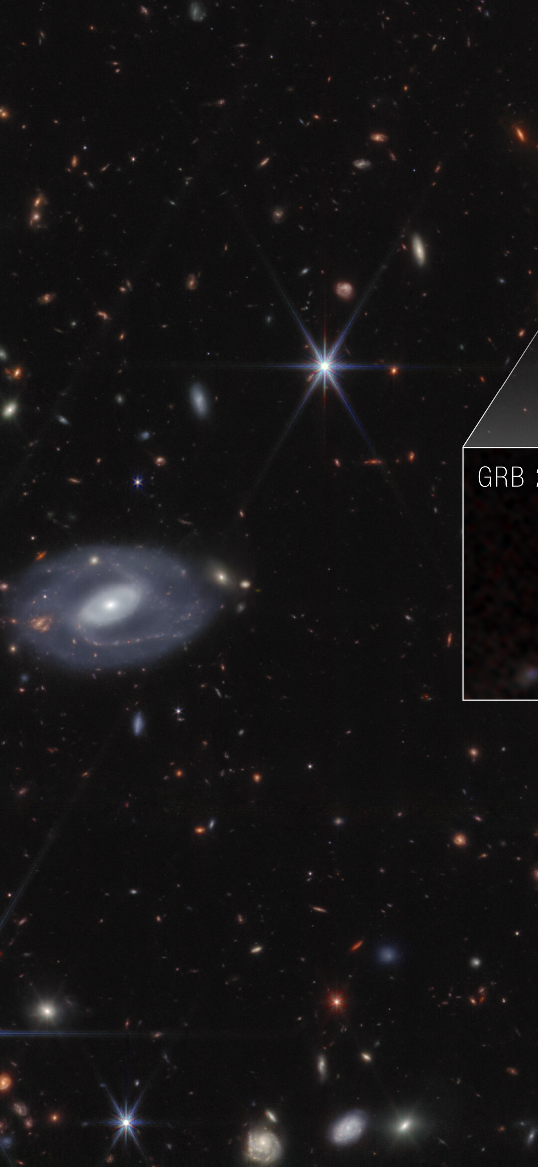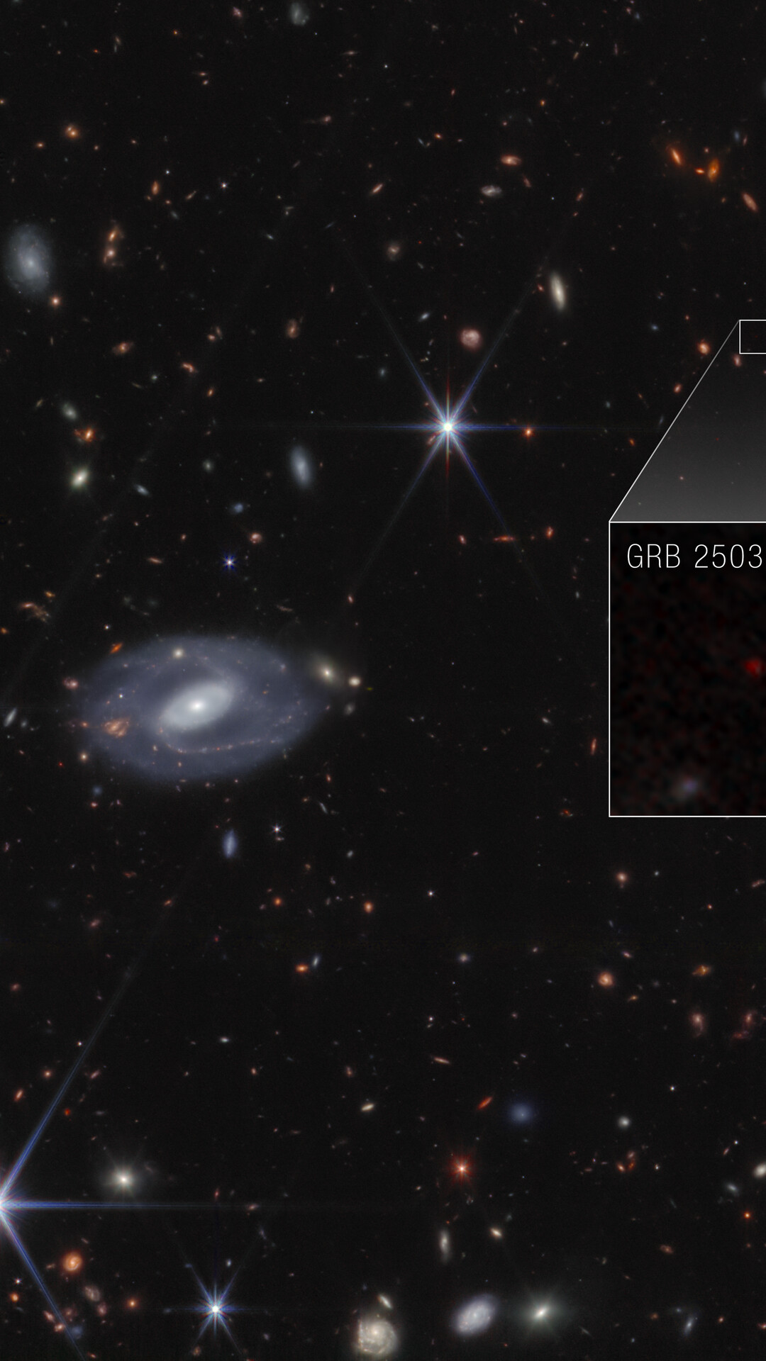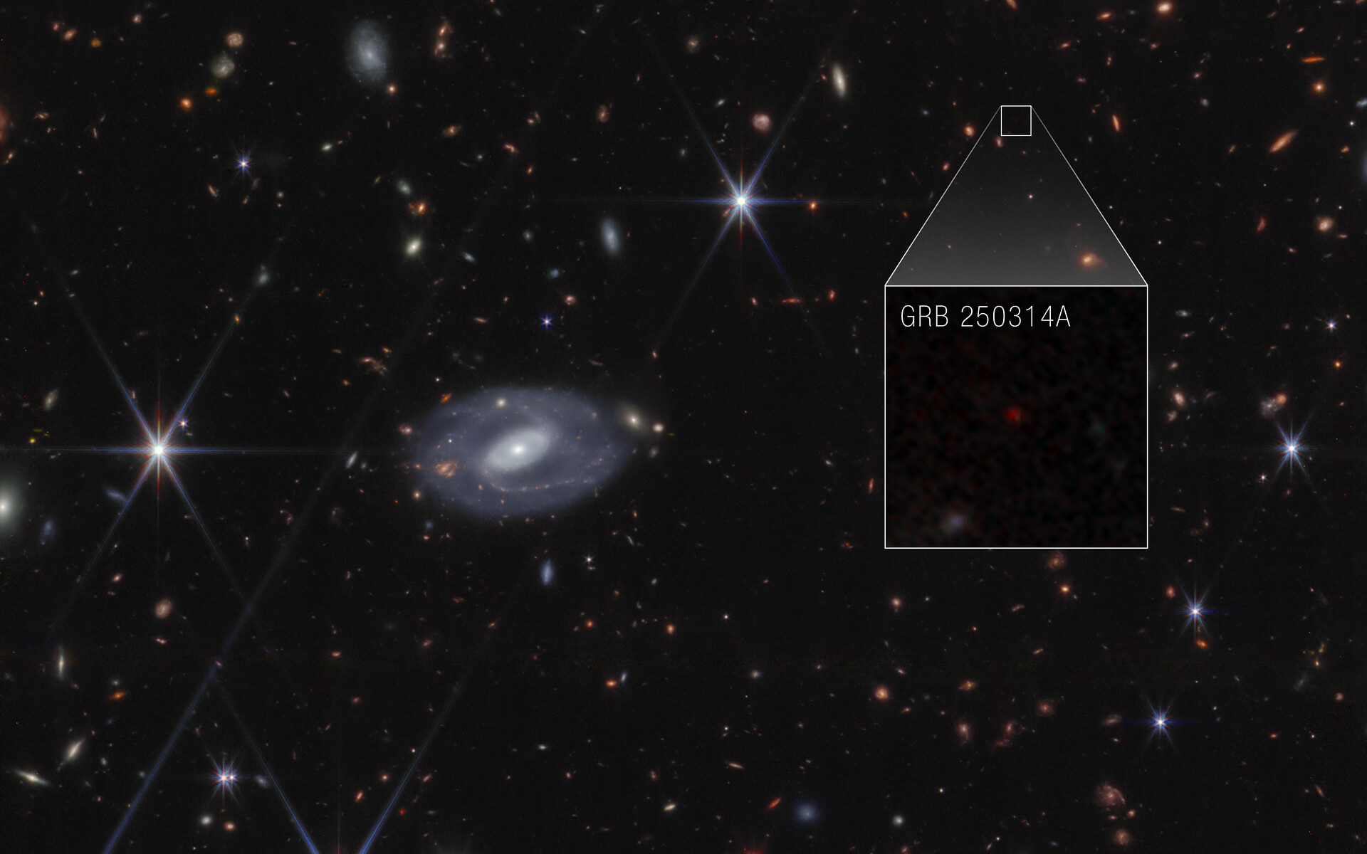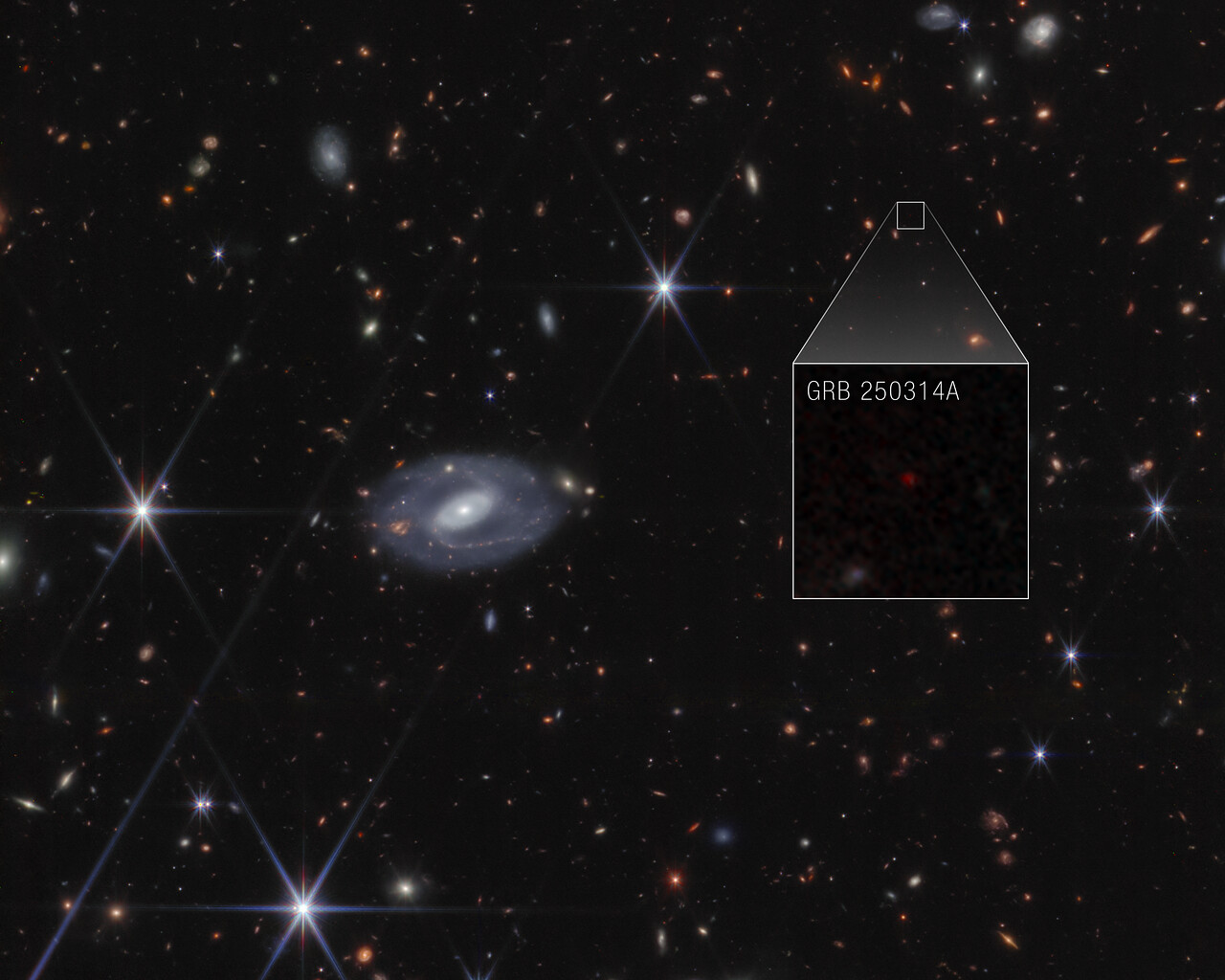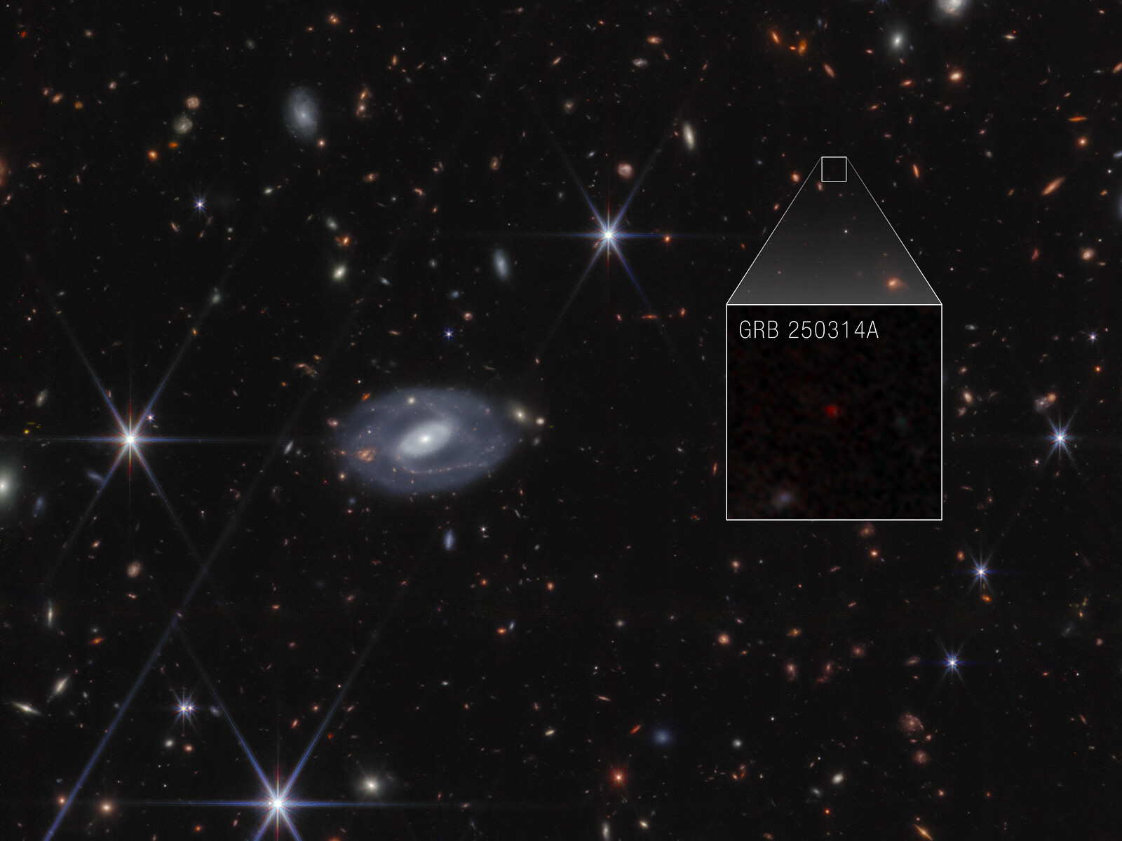 [Image description: Webb image shows hundreds of galaxies of all shapes and sizes against the black background of space. Toward the center-left is a large white spiral galaxy that is almost face-on. To the right of this is a large box, which zooms in on an area at top right. Within the box is a faint red dot at the center, with the label GRB 250314A.]