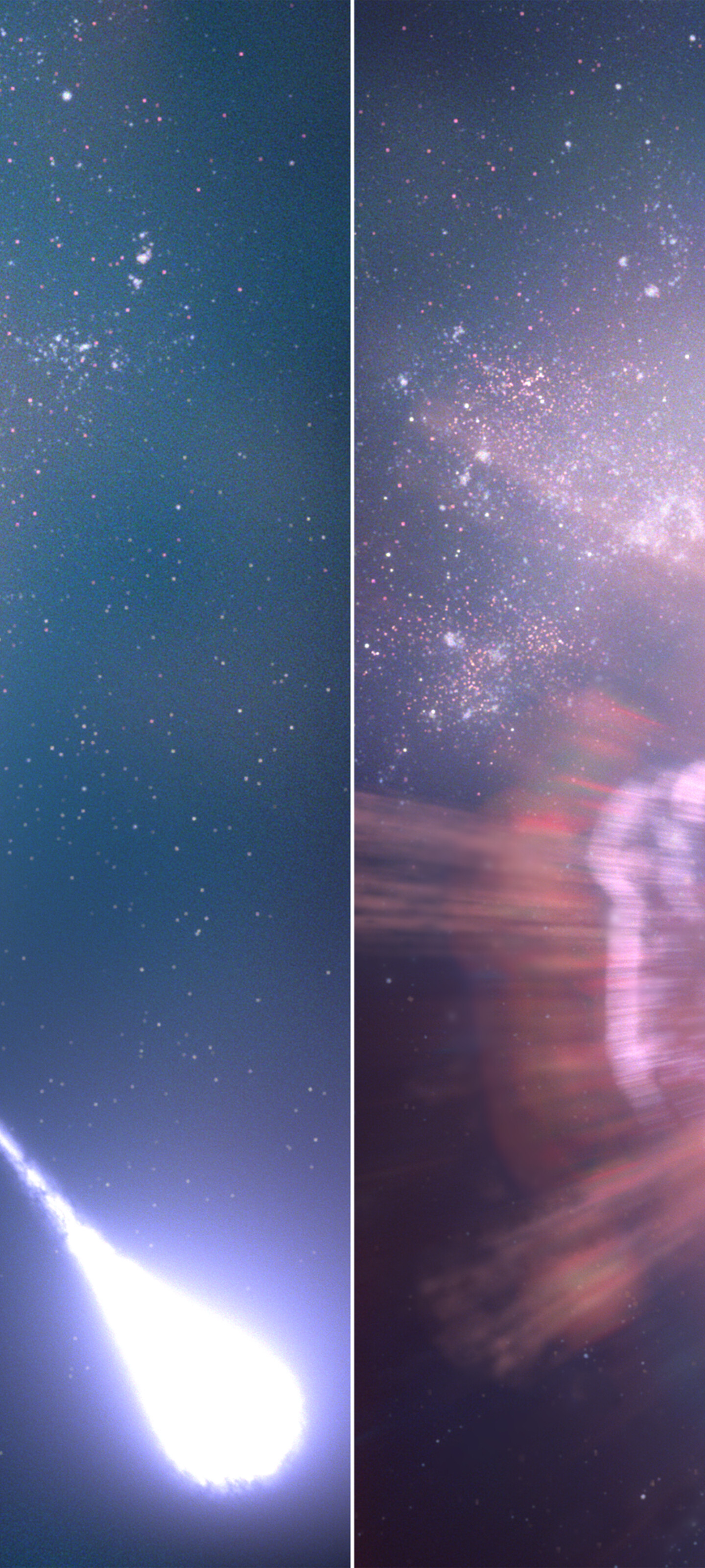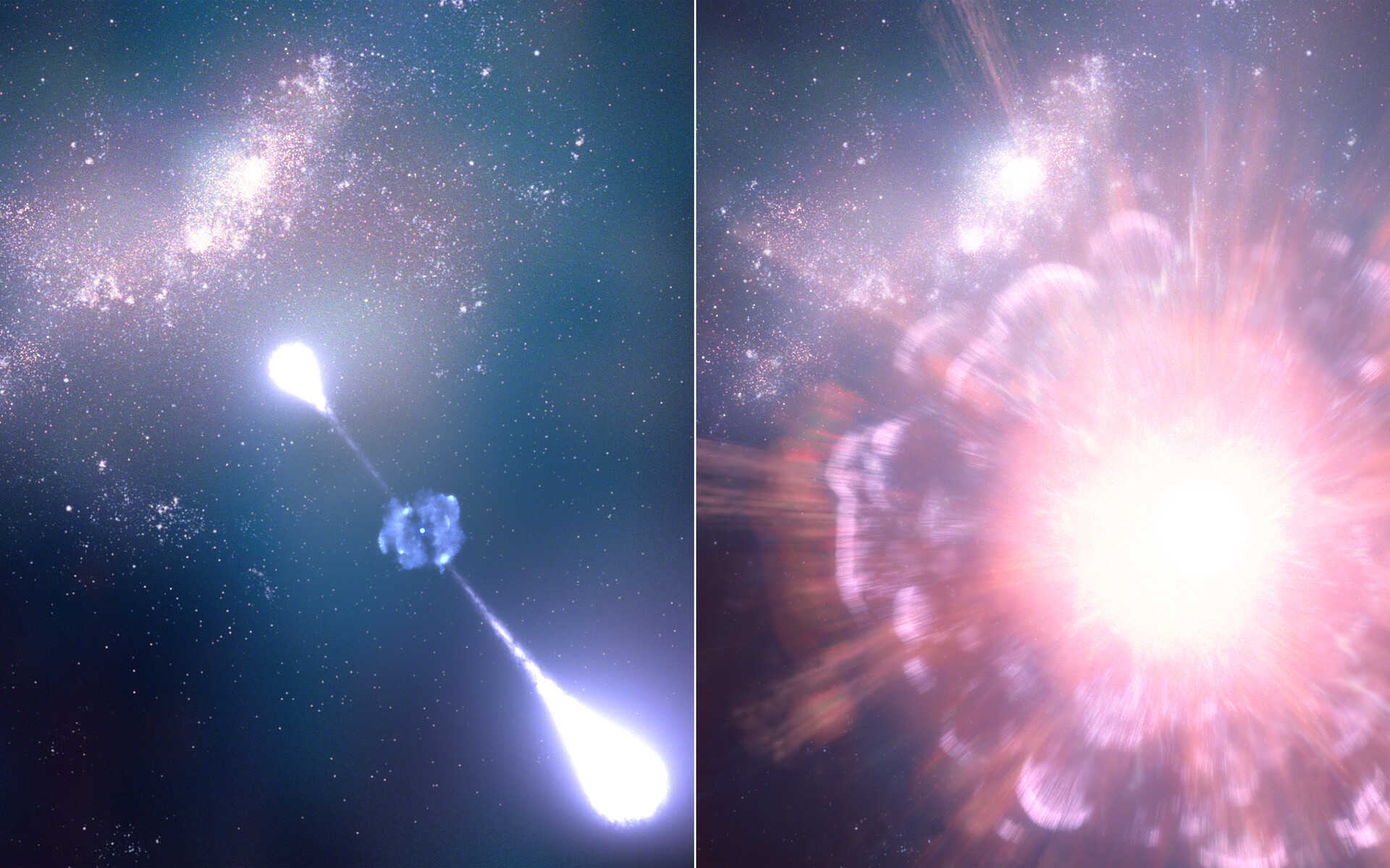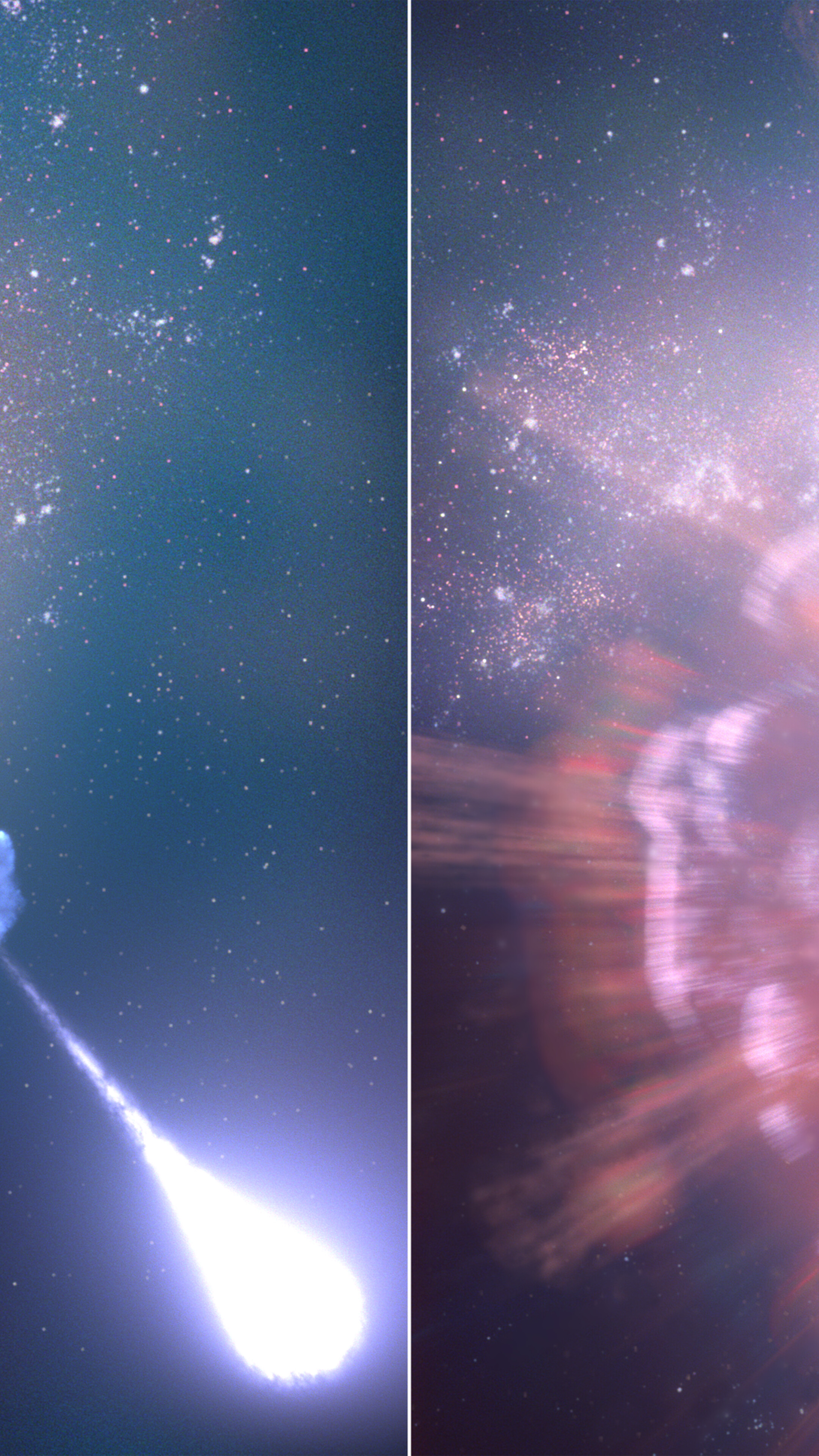 This two-part illustration represents supernova GRB 250314A as it was exploding and three months after that when Webb observed it. Webb confirmed the supernova occurred when the universe was only 730 million years old.