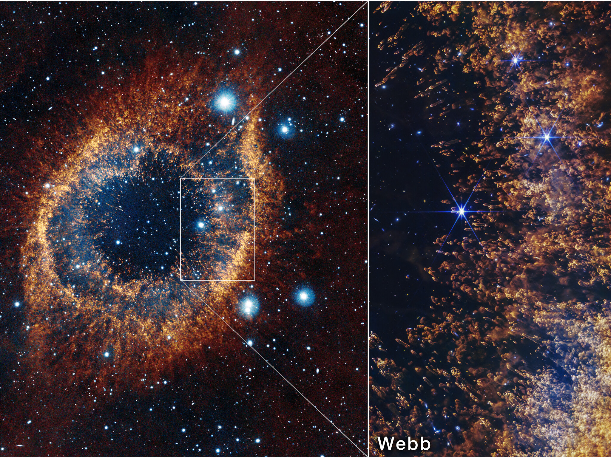 This image of the Helix Nebula from the Visible and Infrared Telescope for Astronomy (left) shows the full view of the planetary nebula, with a box highlighting the smaller field of view from the James Webb Space Telescope’s NIRCam (right).