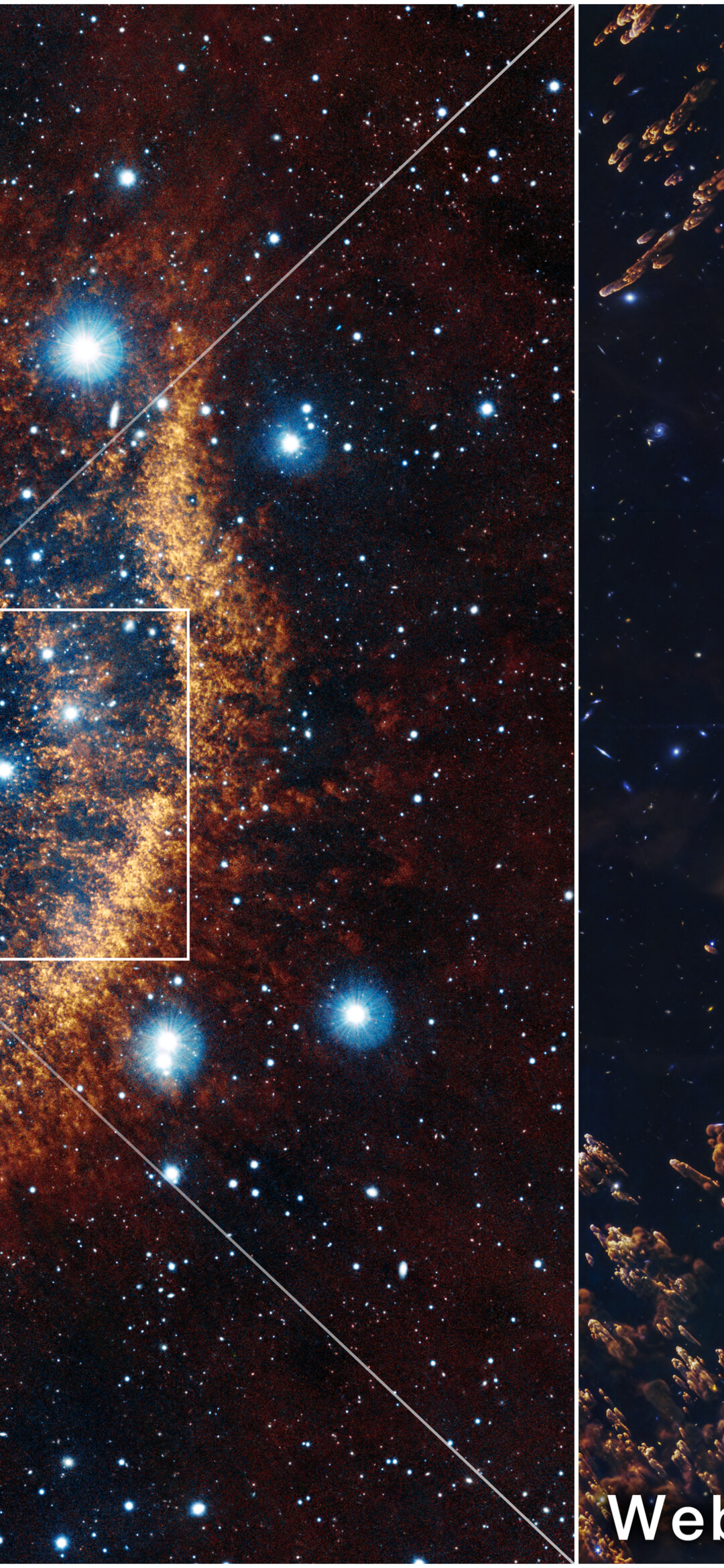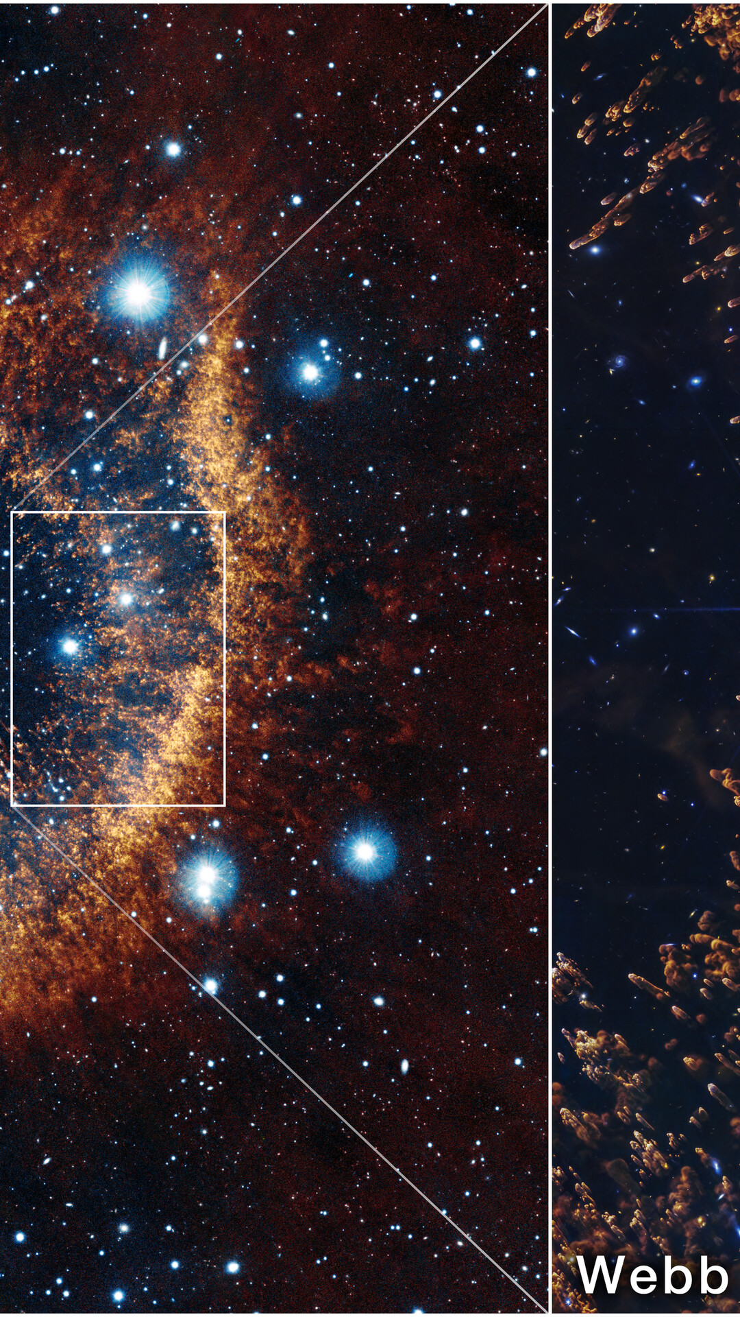 [Image description: Two panels showing different views of a planetary nebula. The left panel, labeled VISTA, shows colorful light from a glowing cloud shaped like an American football at 45-degree angle. Its appearance resembles an eye. The outer edges of the nebula are red and clumpy, and traveling in towards the center, they become yellow and golden. The center of the nebula is black and speckled with tiny stars. At three o’clock along the shell of gas, there is a rectangular box around part of the shell. Lines extend from the box to the right, where the image shows thousands of orange and gold comet-like pillars stream leftward from the right, like thin liquid blown up a sheet of glass. These pillars are around the circumference of the arced shell, which forms a partial orange semi-circle at the right. The pillars are more numerous and denser at the right, and darker red.]