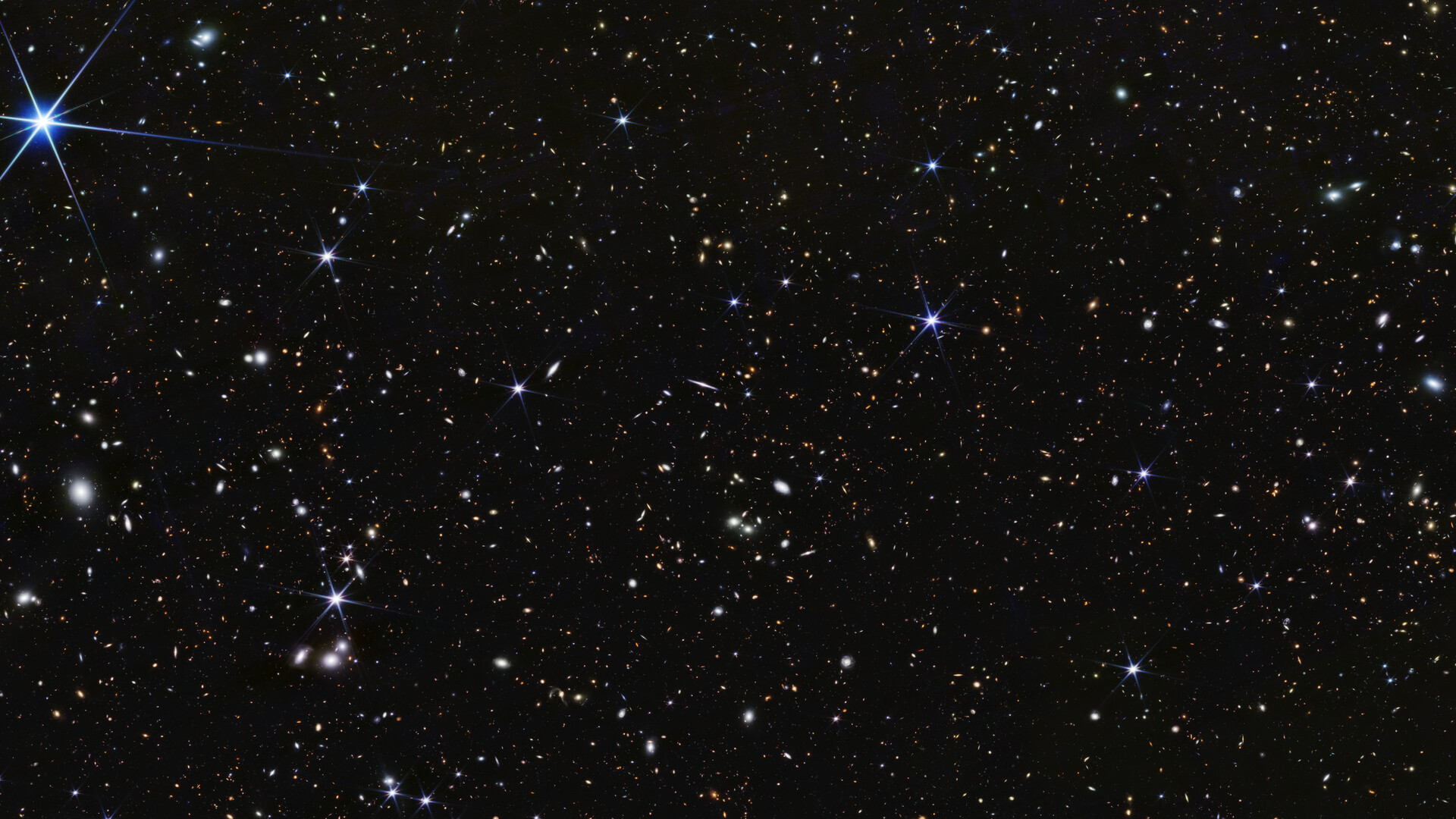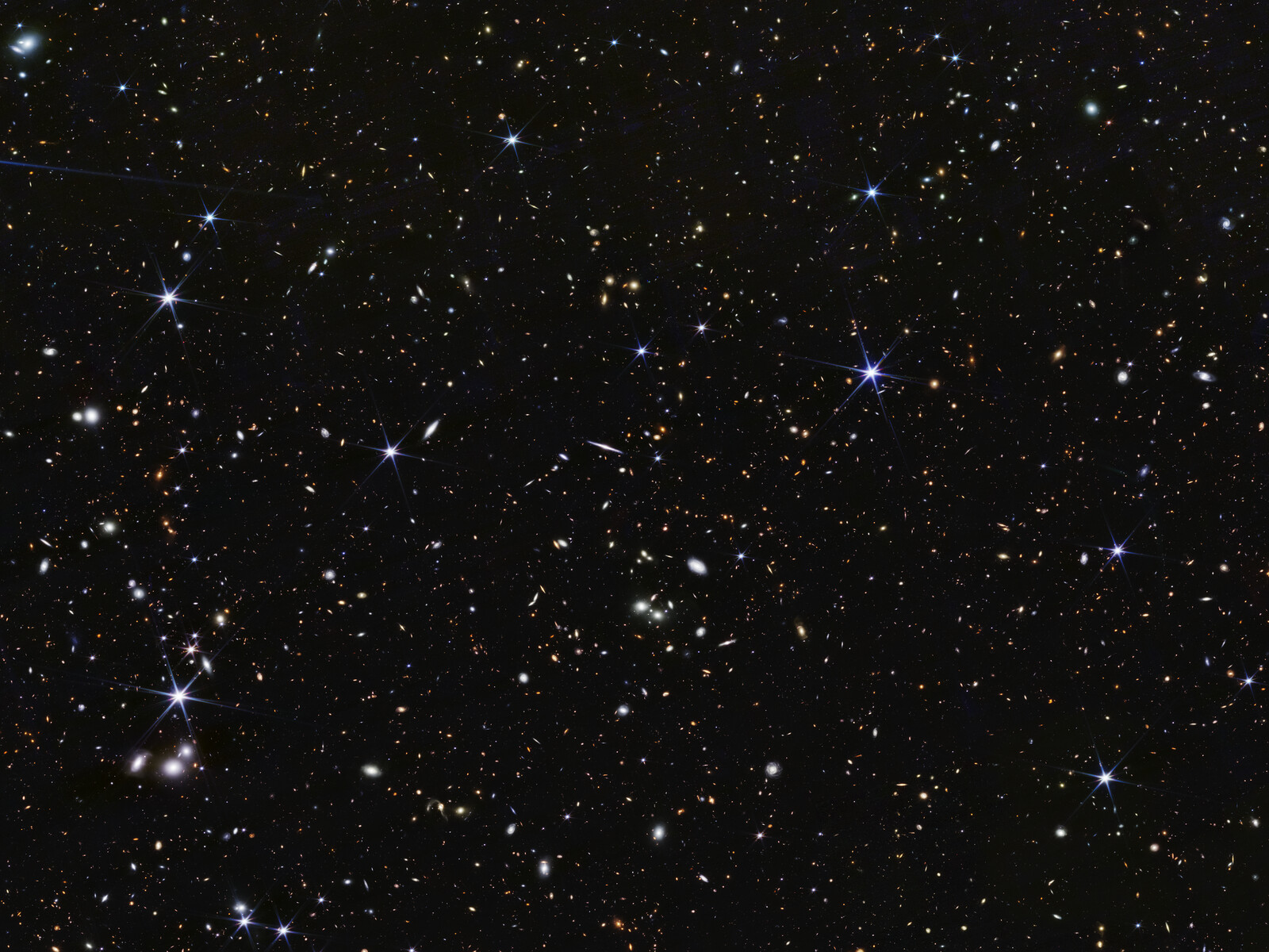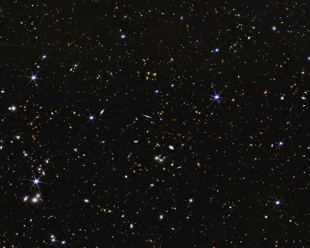 [Image description: A wide field of view showing deep space, dotted with many small galaxies and a few foreground stars that display six diffraction spikes.]