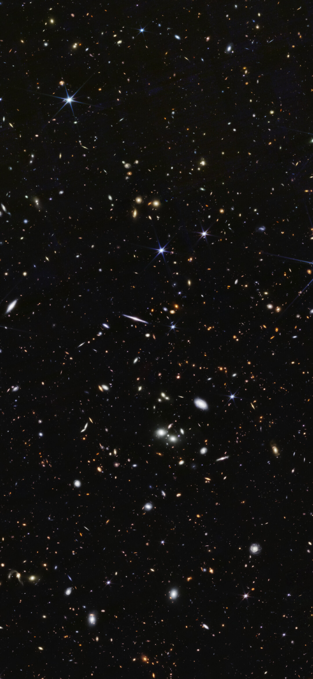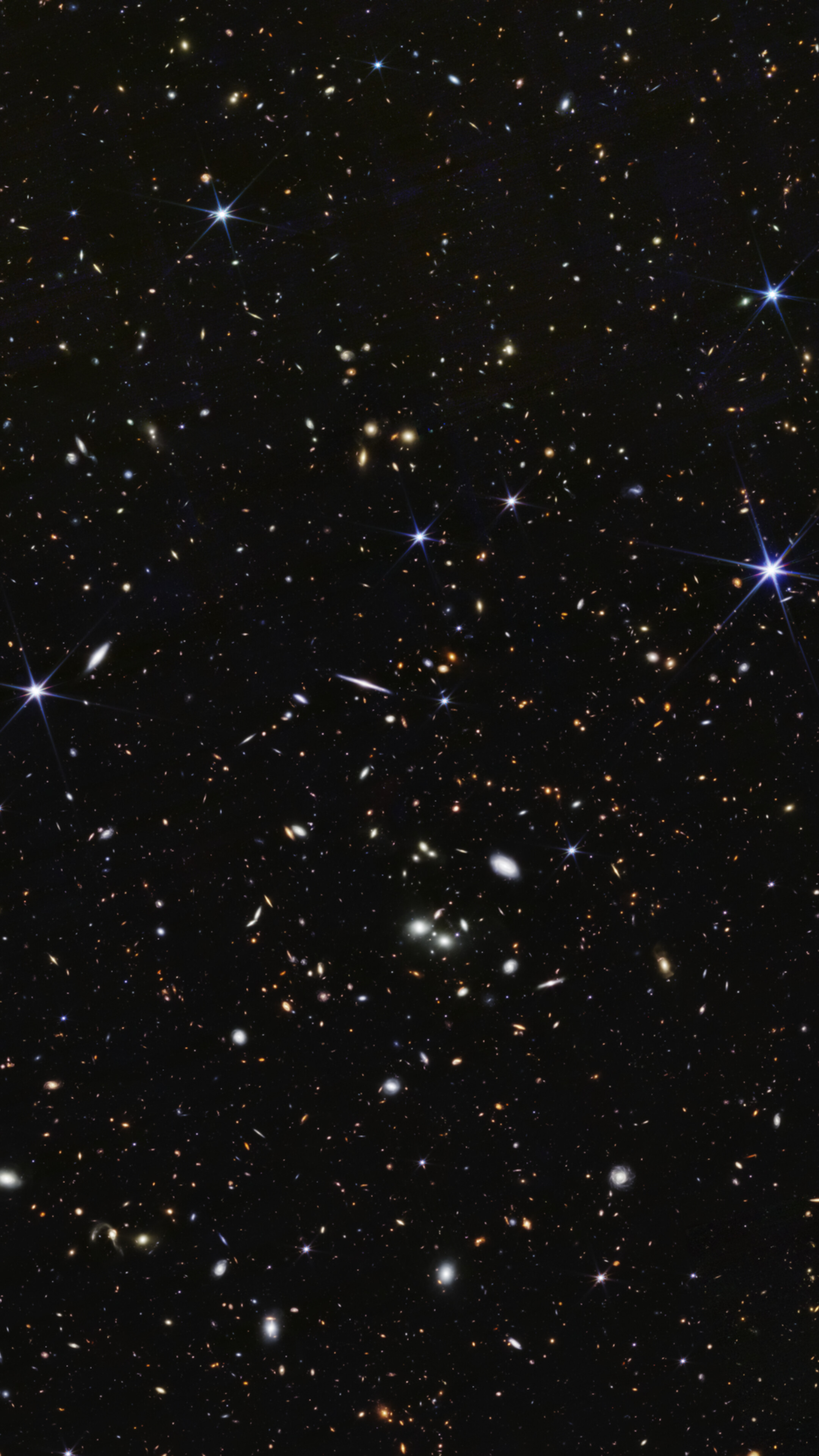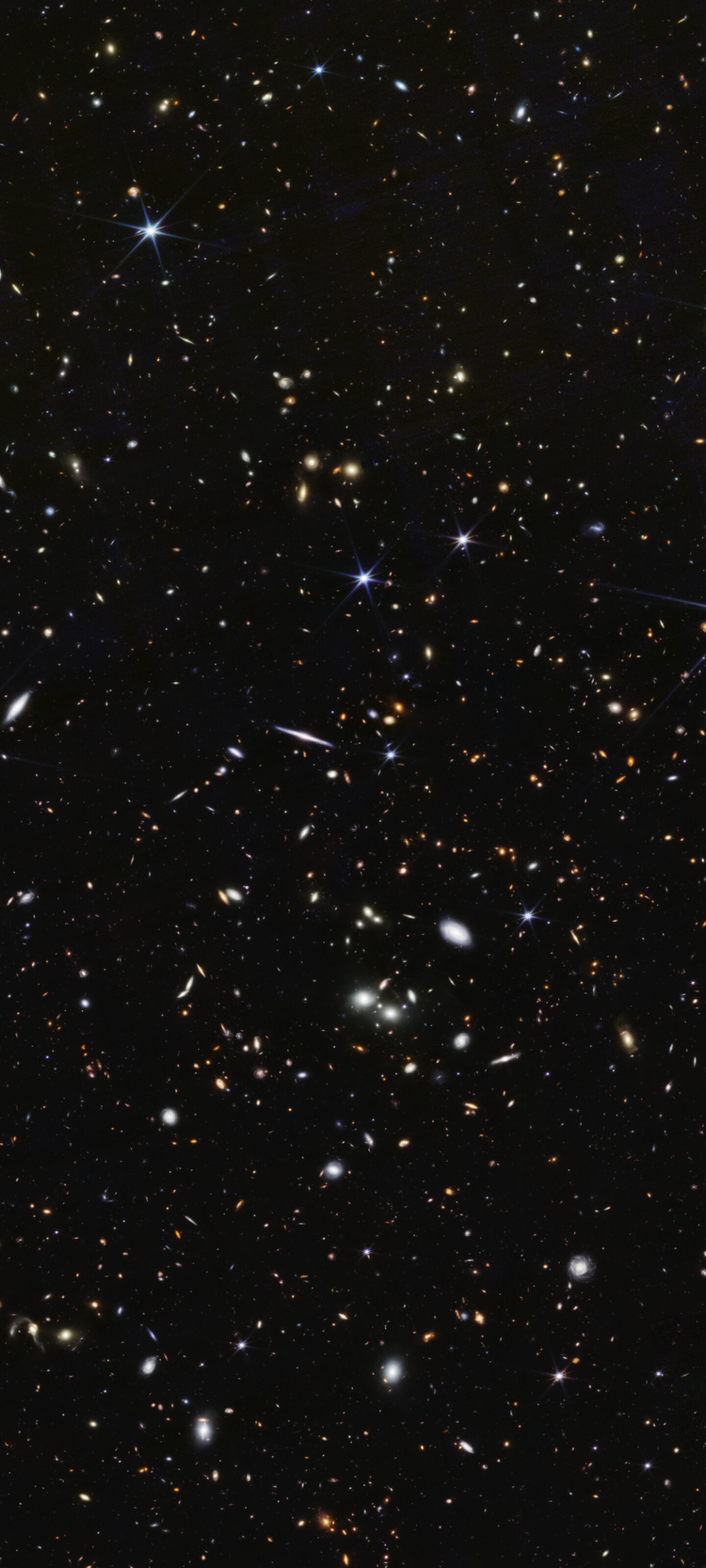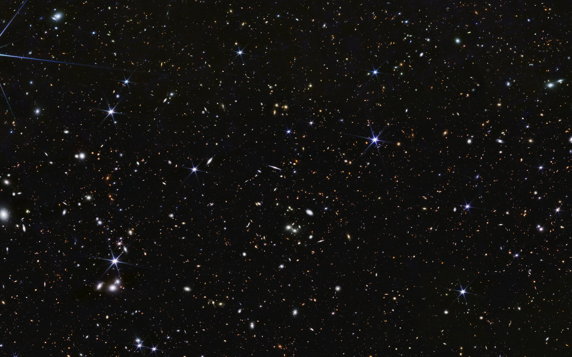 [Image description: A wide field of view showing deep space, dotted with many small galaxies and a few foreground stars that display six diffraction spikes.]