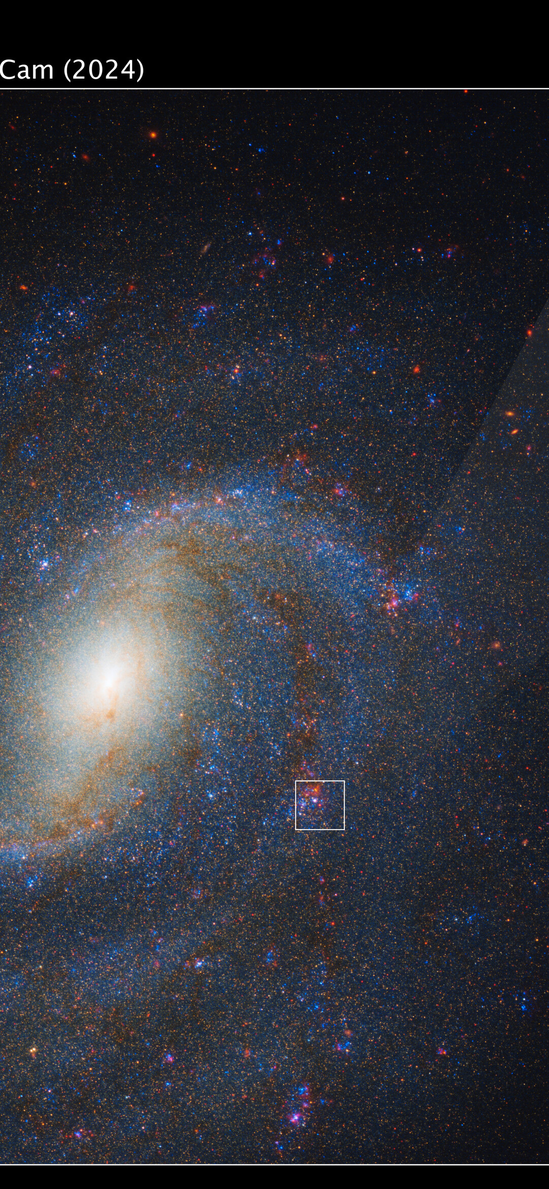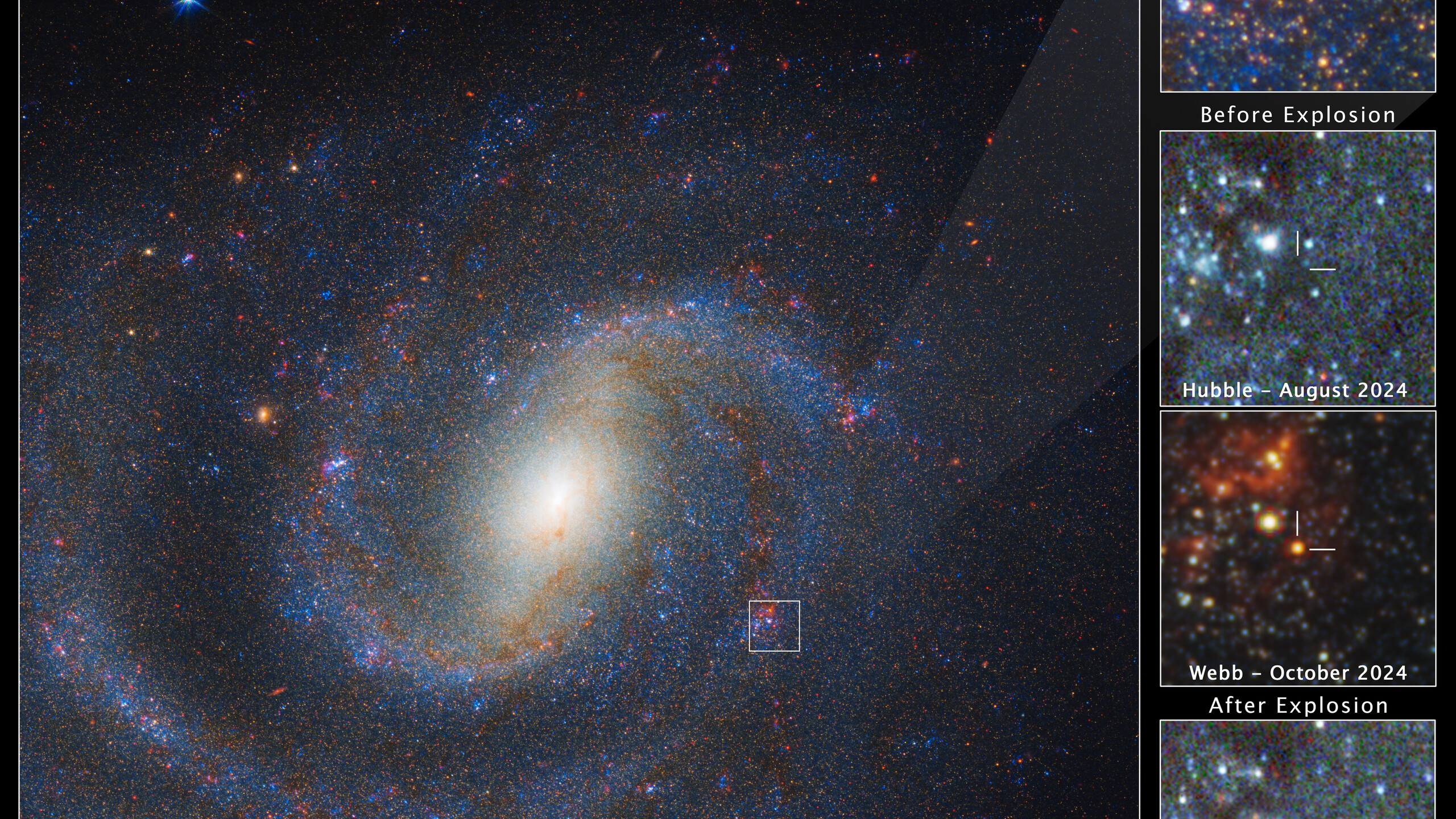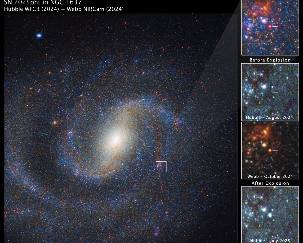 [Image description: An image labeled “SN 2025pht in NGC 1637, Hubble WFC3 2024 + Webb NIRCam 2024”. The majority of the image shows a face-on spiral galaxy speckled with myriad blue and red stars. The yellowish core of the galaxy forms a fuzzy oval tilted to the upper right. About halfway from the core to the edge of the image at about 4 o’clock, a small region is outlined with a white box. A shaded, nearly transparent white triangle extends to a pullout at upper right labeled “before explosion”, with short lines forming a crosshair that points to a red star at the center. Below this are three more square images, all with crosshairs at the same location. 1) Hubble August 2024, with nothing visible in the crosshairs, 2) Webb October 2024, with a red star in the crosshairs, 3) Hubble July 2025, with a blue supernova in the crosshairs.]