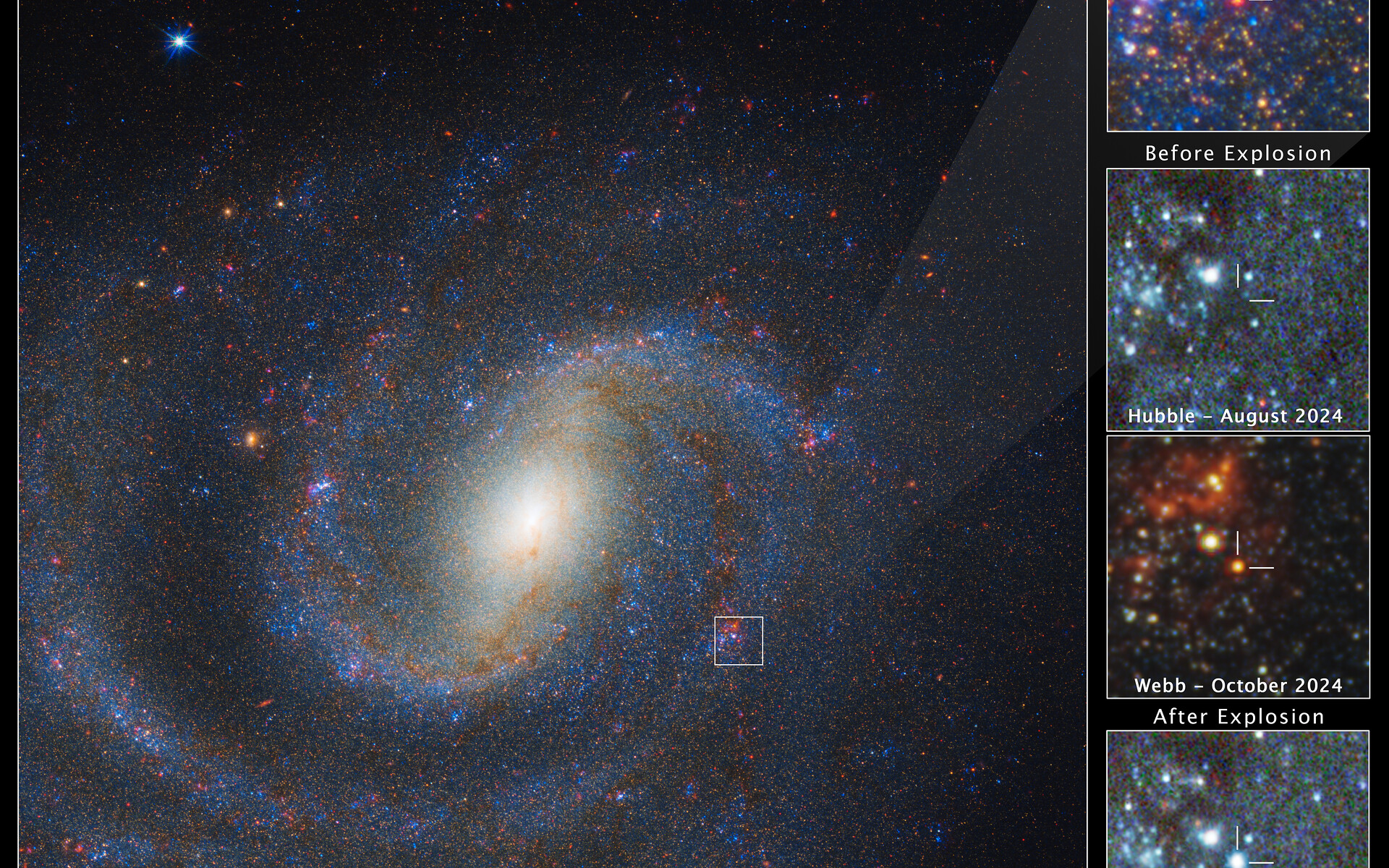 The main image at left shows a combined Webb and Hubble view of spiral galaxy NGC 1637, with the region of interest in the top right. The remaining three panels show a detailed view of a red supergiant star before and after it exploded. The star is not visible in the Hubble image before the explosion, but appears in the Webb image. The July 2025 view from Hubble shows the glowing aftermath of the explosion.