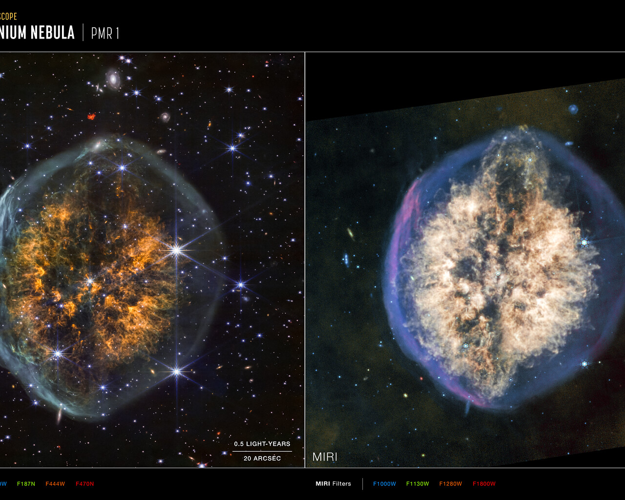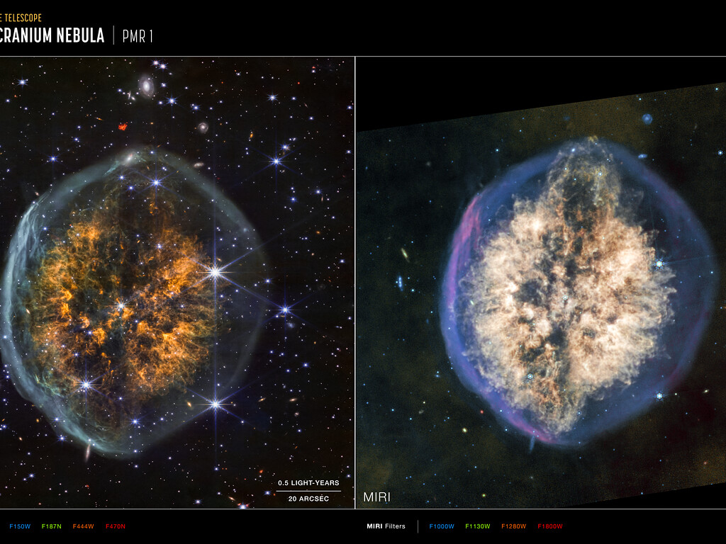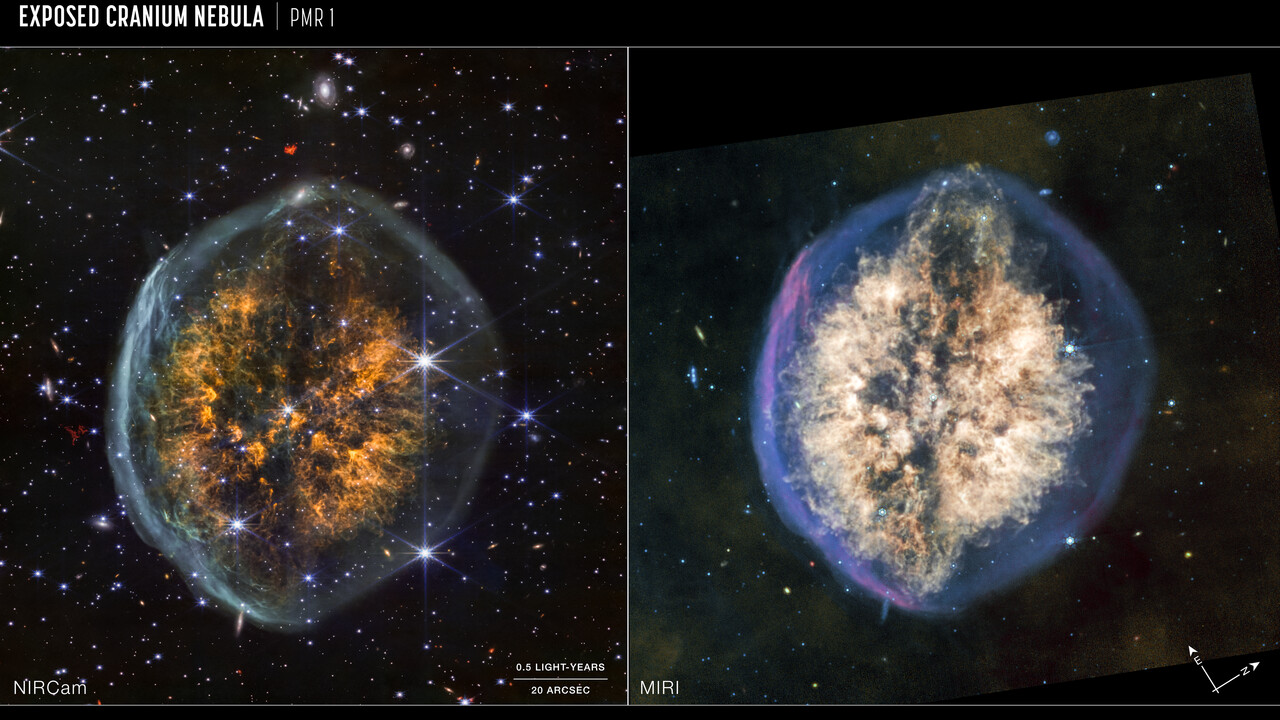 These images of the “Exposed Cranium” nebula PMR 1, captured by the James Webb Space Telescope’s NIRCam (Near-Infrared Camera) and MIRI (Mid-Infrared Instrument) include compass arrows, scale bar, and colour key for reference. Note that the relationship between north and east on the sky (as seen from below) is flipped relative to direction arrows on a map of the ground (as seen from above).