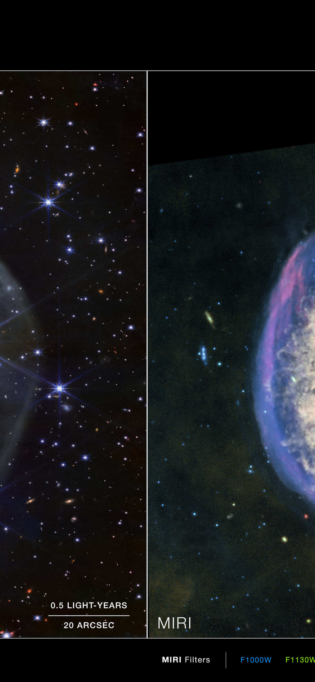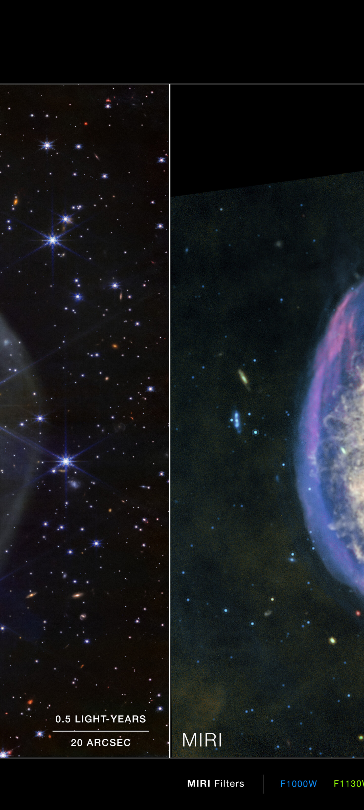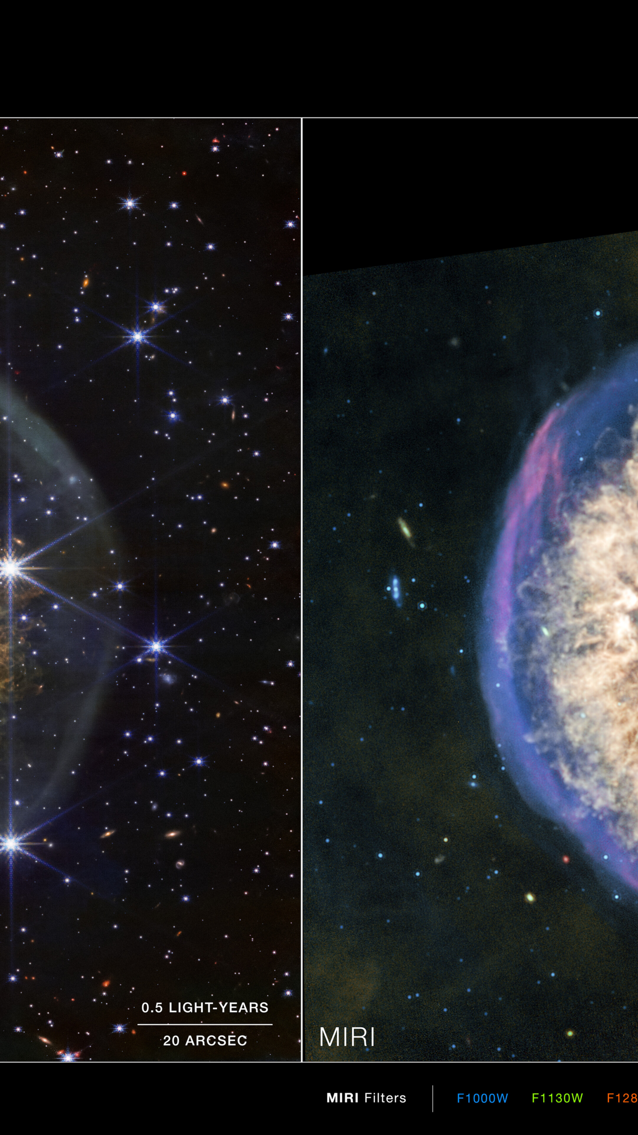 These images show invisible near-infrared and mid-infrared wavelengths of light that have been translated into visible-light colours. The colour key shows which NIRCam and MIRI filters were used when collecting the light. The colour of each filter name is the visible light colour used to represent the infrared light that passes through that filter.