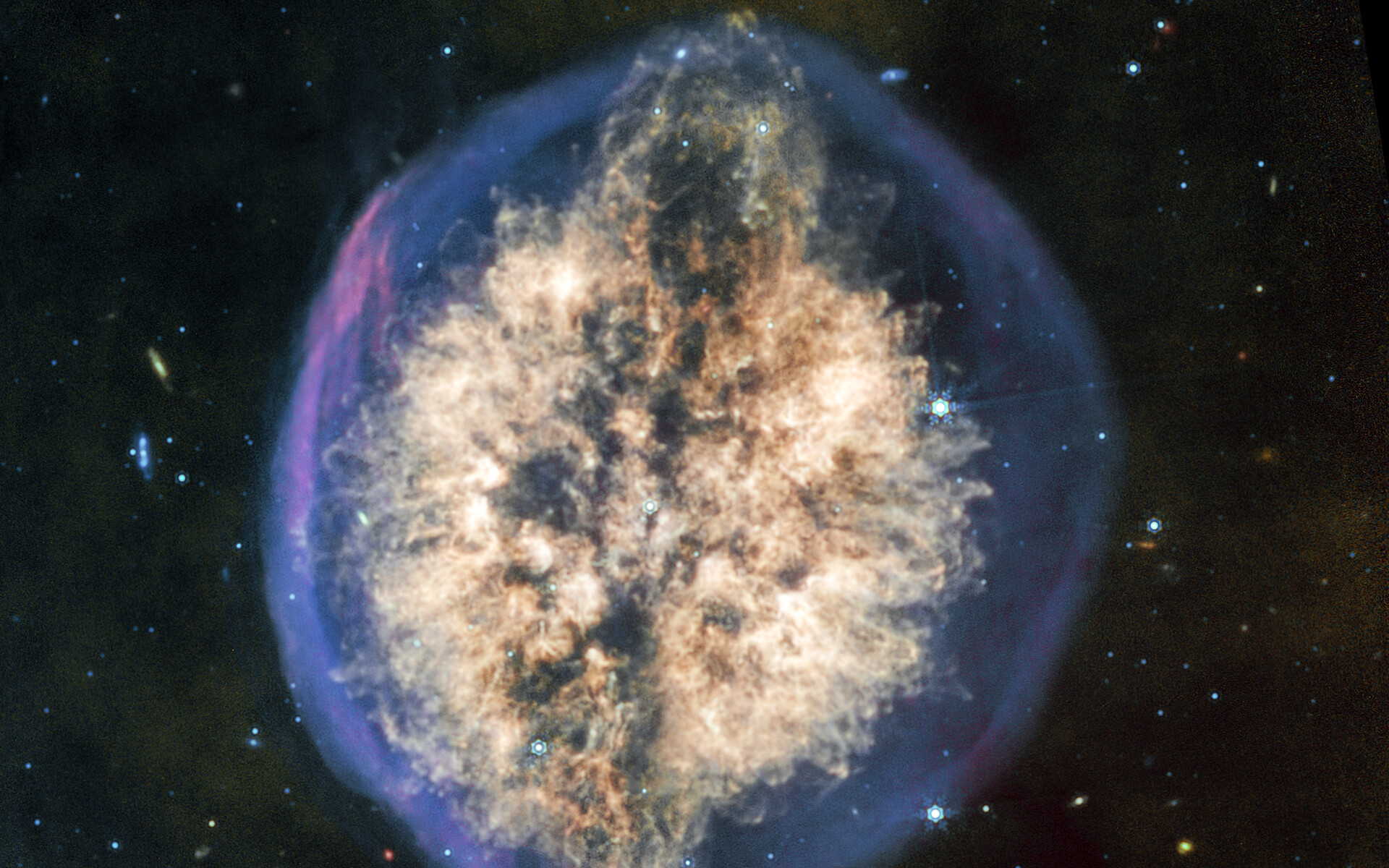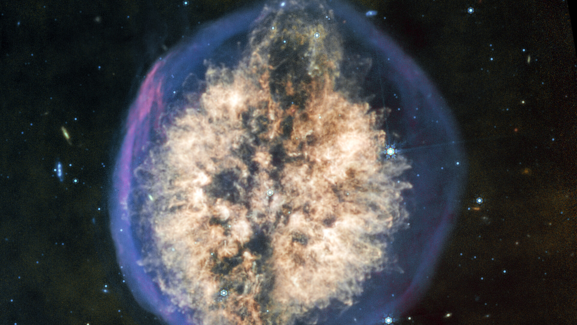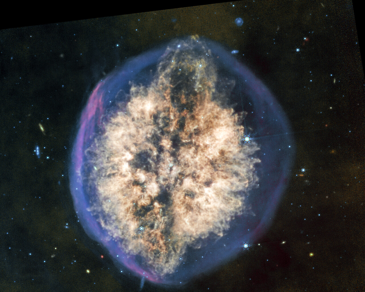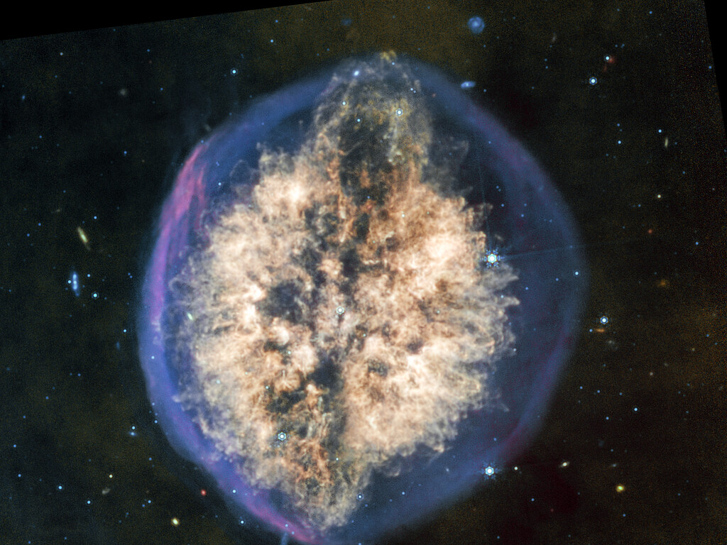 [Image description: A nebula appears like a transparent bubble with a blue edge, inside which are two hemispheres of off-white material being blown out from the centre, interspersed vertically by a dark lane that gives the overall appearance of a brain seen from above. At the top of the nebula the dark lane ends in an oval, with the inner off-white material arcing overtop, giving the impression of an eruption. The bottom of the nebula mirrors this effect, but less dramatically. A few scattered background galaxies can be seen around the outer bubble.]