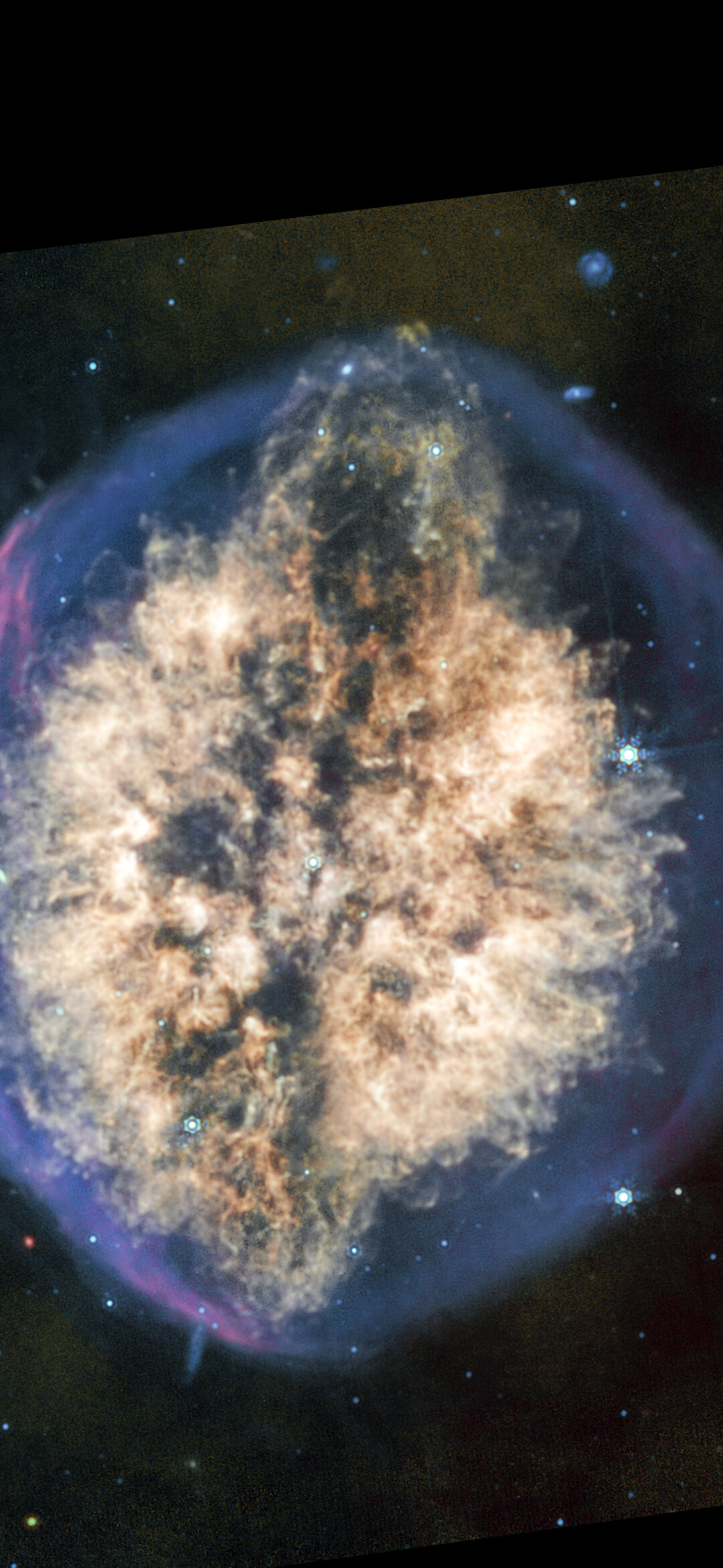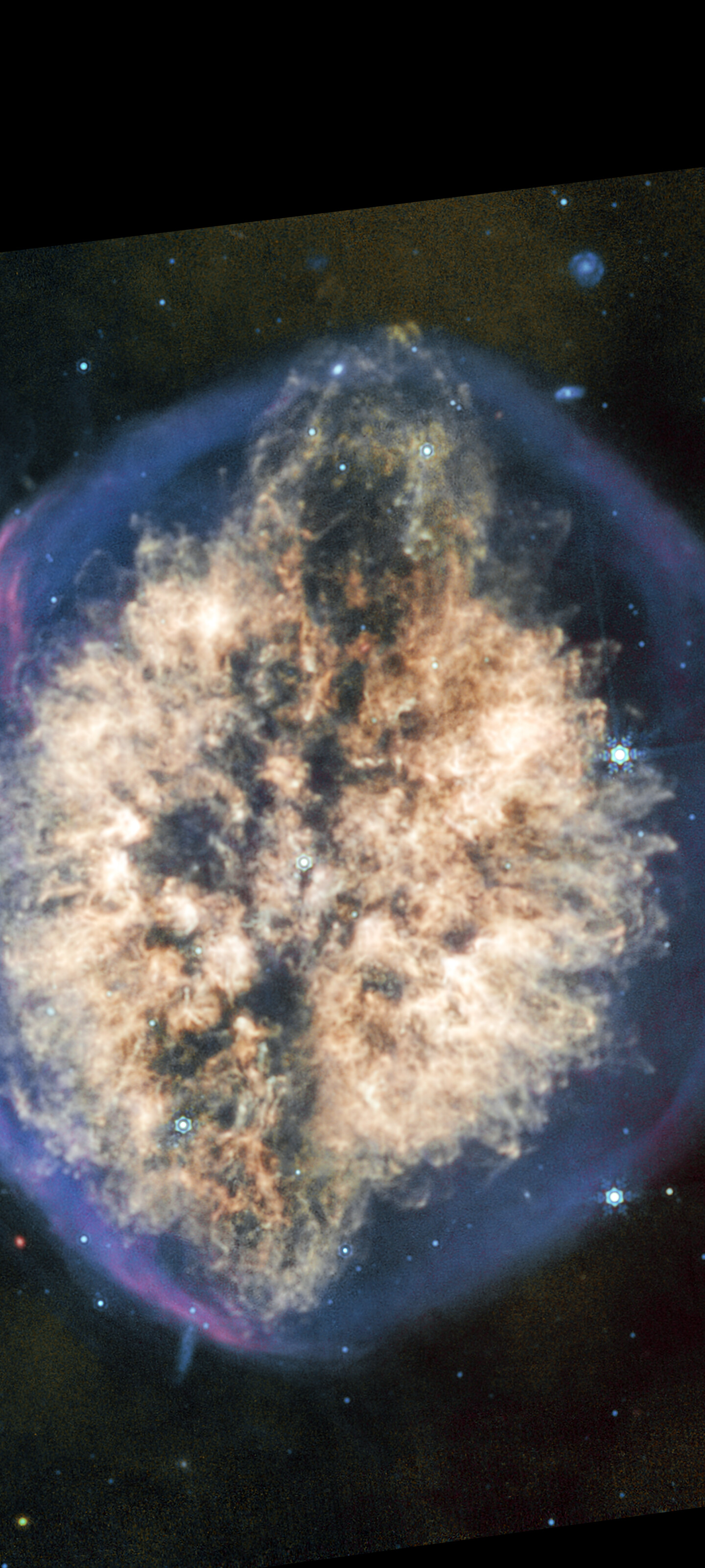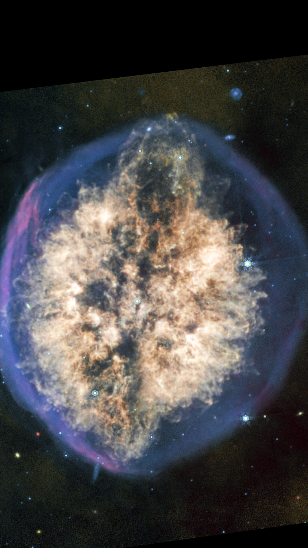 [Image description: A nebula appears like a transparent bubble with a blue edge, inside which are two hemispheres of off-white material being blown out from the centre, interspersed vertically by a dark lane that gives the overall appearance of a brain seen from above. At the top of the nebula the dark lane ends in an oval, with the inner off-white material arcing overtop, giving the impression of an eruption. The bottom of the nebula mirrors this effect, but less dramatically. A few scattered background galaxies can be seen around the outer bubble.]