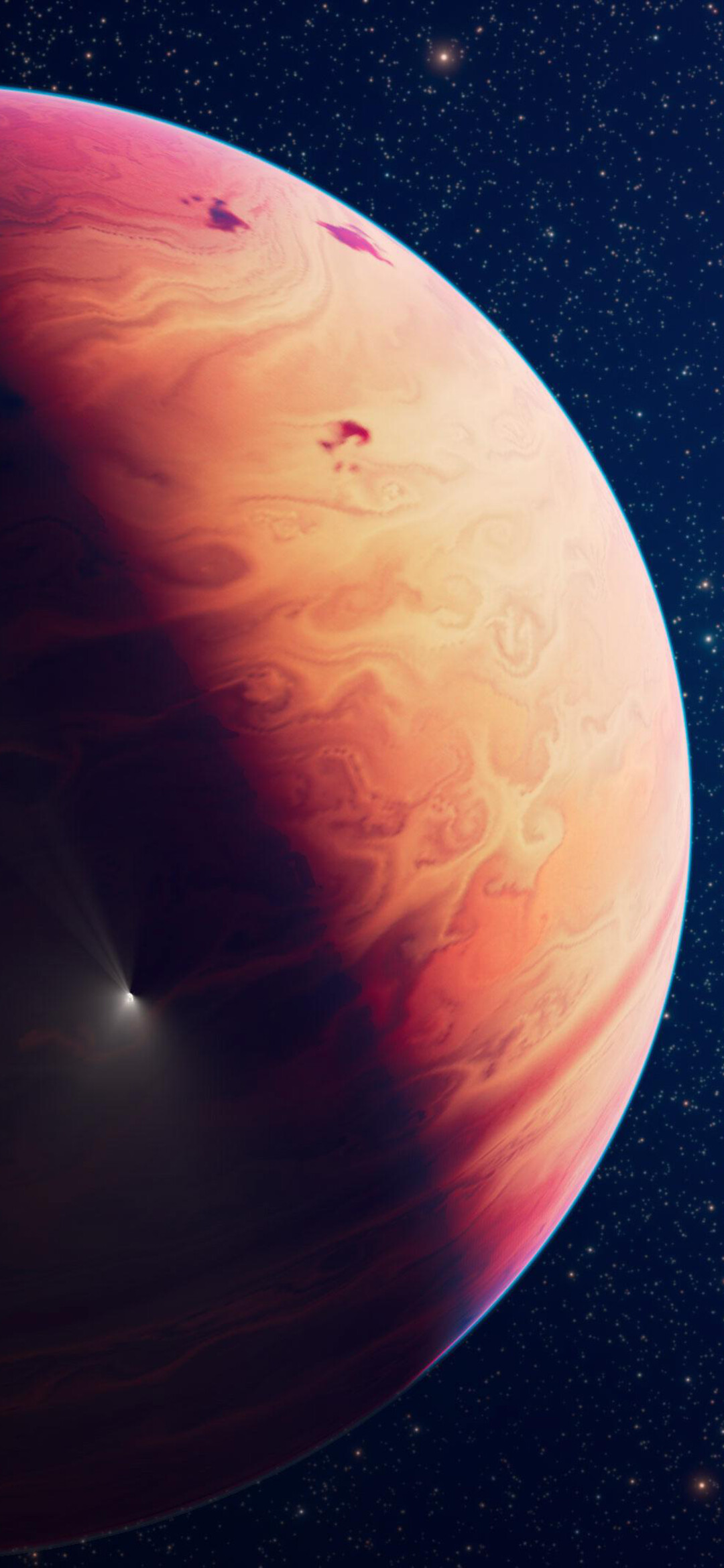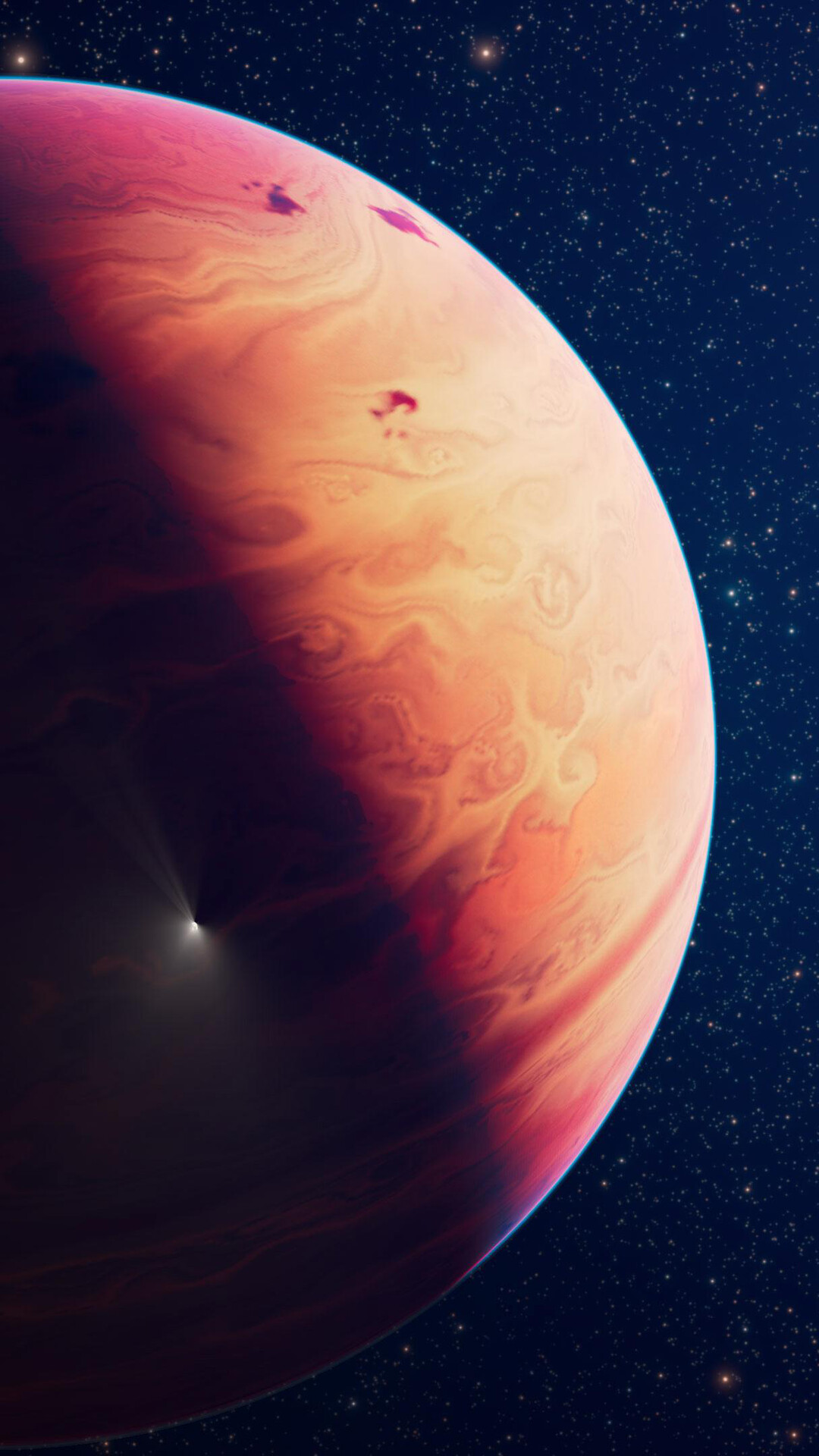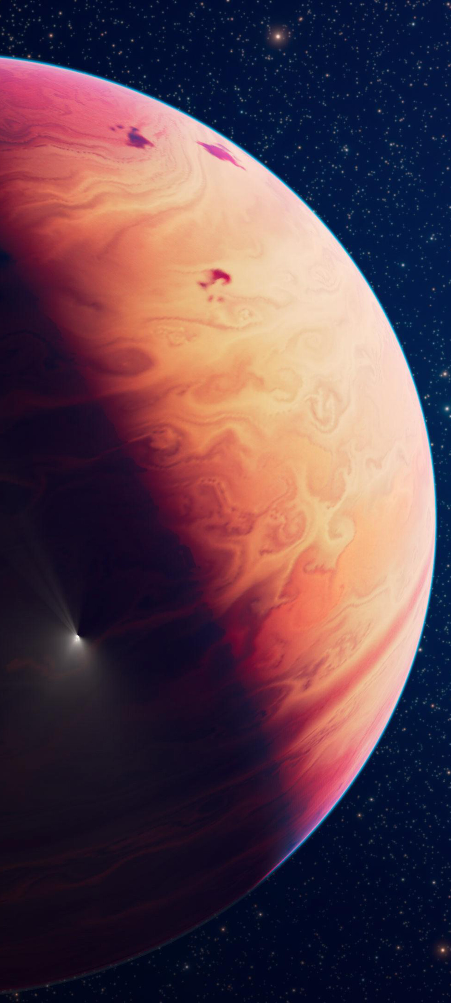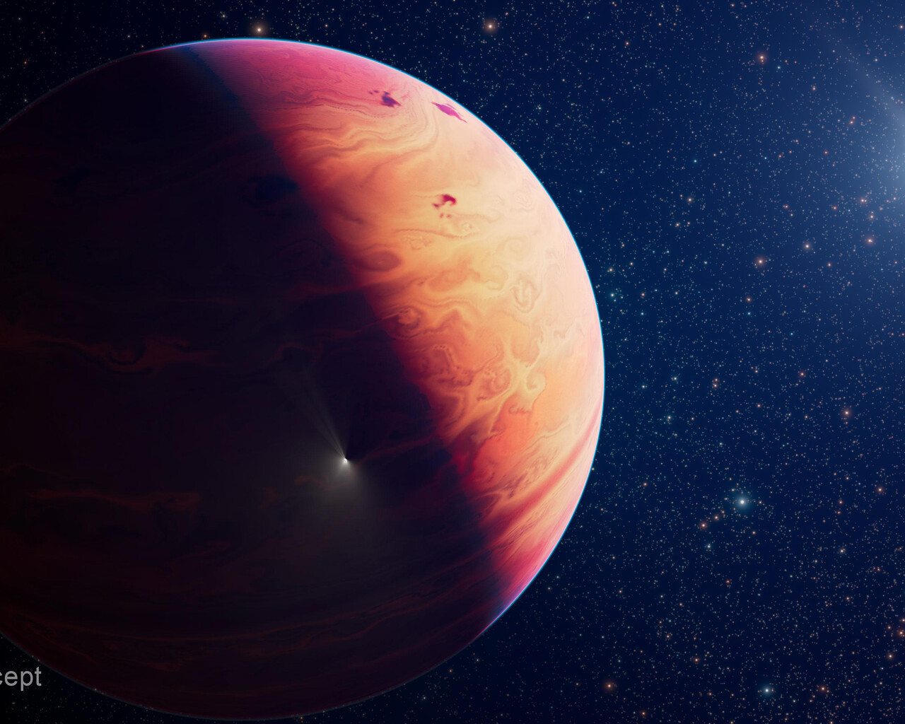 Exoplanet 29 Cygni b, seen in this artist’s concept, is a gas giant weighing about 15 times the mass of Jupiter. It orbits a type A star (shown at upper right) slightly hotter and more massive than our Sun, at an average distance of 2.4 billion kilometres. The star is known to possess a dusty debris disc. A hypothetical comet fragment is shown approaching the planet, while previous impacts have left dark splotches on its cloudtops, similar to what was seen from the Shoemaker-Levy 9 impact on Jupiter in our solar system.