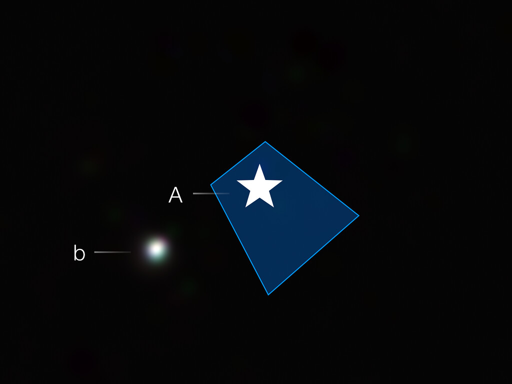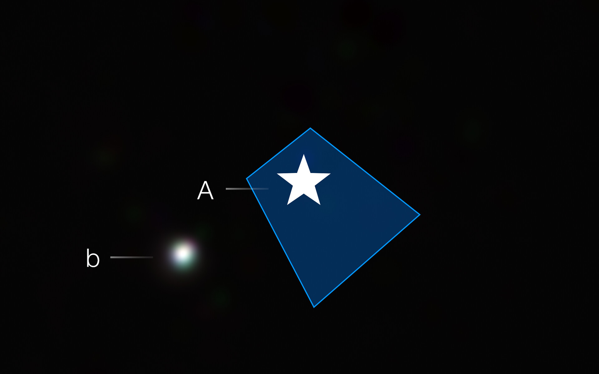 Webb’s NIRCam (Near-Infrared Camera) was used in its coronagraphic mode, in which a wedge (indicated by the blue box) is used to block the light of the host star (labeled A and marked with a star symbol) to reveal the planet. This image combines light from three filters between 4 and 5 microns. The planet is brightest in the blue filter, then green, then red, so it appears as an off-white dot in the colour composite. If carbon dioxide weren’t present, the planet would appear noticeably redder.