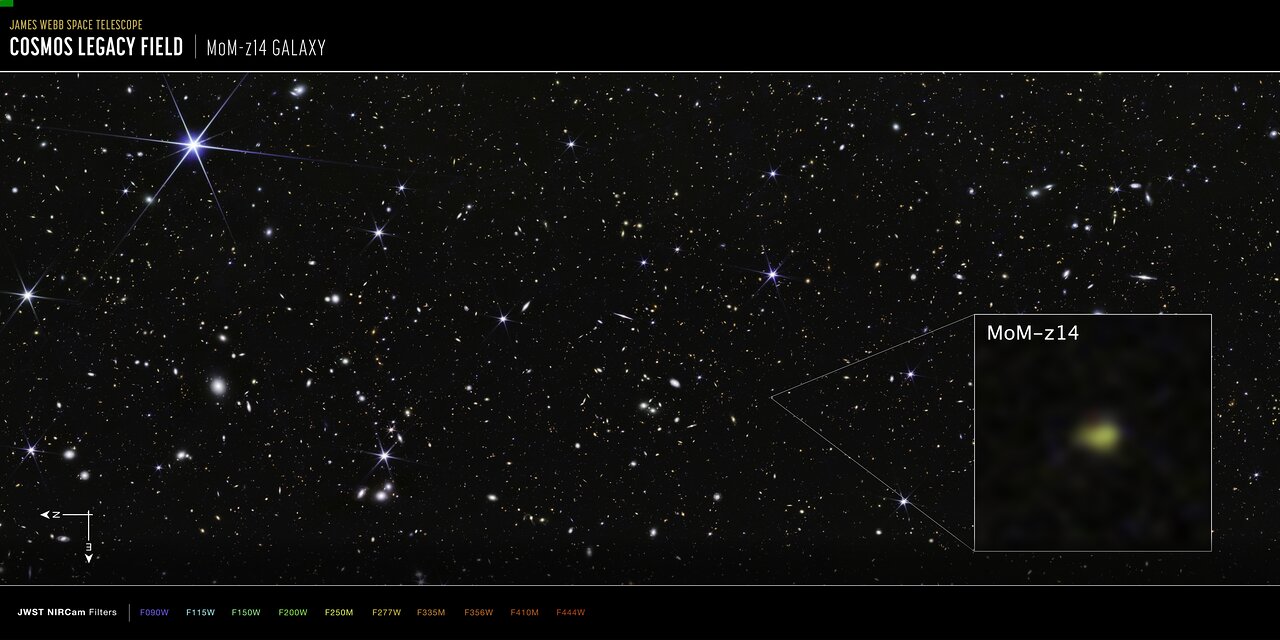 Due to the expansion of the Universe that is driven by dark energy, discussion of physical distances and “years ago” becomes tricky when looking this far. Using Webb’s NIRSpec (Near-Infrared Spectrograph) instrument, astronomers confirmed that MoM-z14 has a cosmological redshift [1] of 14.44, meaning that its light has been travelling through (expanding) space, being stretched and “shifted” to longer, redder wavelengths, for about 13.5 of the Universe’s estimated 13.8 billion years of existence.